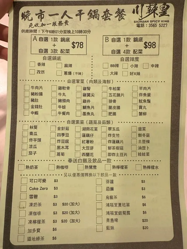 行過旺角肚仔餓,見到有晚市 一人餐干鍋,供應時間為晚上六點到十點半。 一個鍋底加四個配菜都係98蚊, 奉送飲品加白飯。 係旺角親民價。 一人鍋嘅構思幾好,因為跟朋友食嘅辣度唔相同,所以 一人一個鍋唔使遷就別人嘅辣度。 一坐低 侍應就畀張點心紙我自己點。 餐廳叫做「川辣皇」當然要食頂級辣,睇佢有幾川辣。 叫咗個「好X辣」, 配菜叫咗羊肉 、豬肚、豆卜及芋頭。叫咗「好X辣」,心臟一定要好強大。真係辣到噴火,但係又好過癮。好滅壓,尤其工作辛苦咗一天,就係特別想食辣, 頂級辣度, 越食越流口水, 越食越開胃。講返佢啲羊肉,沒有羊騷味,而且好嫩滑。最正係個豬肚,好爽。豆卜入曬啲辣味,簡直係精華所在, 芋頭都好入味,總體成個鍋炒得幾好。配白飯一流。而我朋友唔食辣就點咗個洋蔥炒牛肉。 呢個洋蔥炒牛肉鑊氣非常夠,牛肉好入味。下次想試下酸菜魚 …Read More