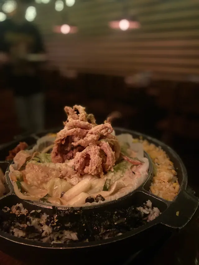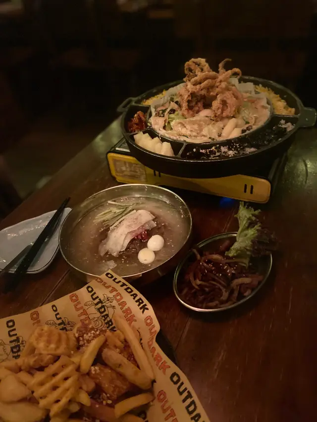 因為韓國朋友帶路,佢鍾意新派韓國菜,所以我就同佢黎食呢間。#outdarkhk 所有野都係韓國人自家製,所以都還原到韓國新派韓餐既味道。海鮮忌亷炒年糕:年糕本身係非常有米香同彈性,加入咗西式既忌廉汁,食落奶香十足。入面仲有什菜、蝦仁、魚糕,面頭炸過既魷魚有脆感,可以揀點旁旁既芝士/忌廉汁一齊食,味道非常有層次。旁邊仲有菠蘿、泡菜、紫菜飯,食落新派得黎幾得意!但如果芝士可以多少少就好,咁就可以更加邪惡咁包住野食!甜辣炸雞:主角之一炸雞甜味比辣醬勁,會食到淡淡蒜香+果香,裡面既雞肉滑。韓式水冷麵+韓式炒牛肉:水冷麵加入芥末、醋,食落酸酸地,麵條加入冰塊成件事更加有彈性,清新,同埋中和咗其他菜式既膩感。成間餐廳都黑得黎,用埋木台,都幾有格調。最後同朋友走之前仲有得玩免費既photo booth,都幾有體驗感。開心!…Read More