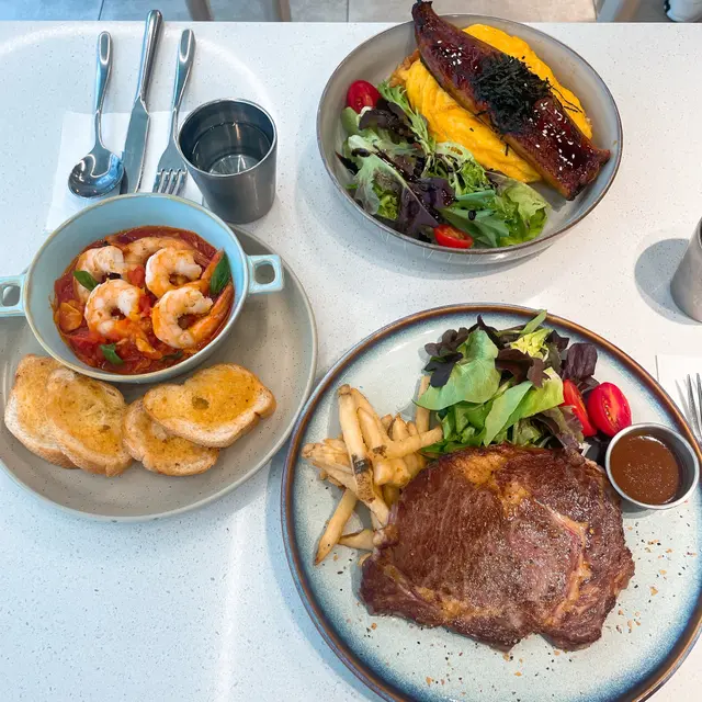 落地大玻璃透住街外霓虹光🌃,頭頂大大小小吊燈好似星星咁閃呀閃🌟,影相打卡靚到唔捨得食嘢📸!🍳滑蛋原條鰻魚薏式紅飯滑蛋真係滑到似絲綢🥚✨,鰻魚厚肉到咬落啖啖油香🐟🔥!紅飯用咗薏米有咬口又健康🌾,撈埋半熟蛋黃汁一啖入口... 哇!邪惡又滿足啊🤤💯🥩烤美國安格斯肉眼牛扒配燒汁牛扒外層焦香脆邊🔥,切開仲見到粉嫩肉心💘!薯條勁有心思,撒咗蒜粉同香草🌿,脆到停唔到口🍟😍 燒汁帶少少甜,同牛味超夾👍🌶️香辣蕃茄蝦配蒜茸包蝦肉爽彈到會跳舞💃,辣汁係嗰種慢慢滲上嚚嘅刺激🌶️🔥!蒜茸包脆得嚚唔油膩,點汁食到"索索"聲👂🍞 口感層次多過變臉👏☕香橙咖啡橙皮香氣先攻鼻🍊,飲落咖啡苦中帶果甜☕💫 凍飲仲有片橙乾浮面,打卡able到爆📸❄️🍓士多啤梨奶昔濃稠到要用匙羹🥄,每啖都飲到草莓粒粒🍓💦 甜度剛好唔假滑,上面堆滿鮮果好IGable📱✨鰻魚滑蛋邪惡之最🥇,牛扒薯條惹味到舔手指🤌,香辣蝦嘅脆包同咖啡橙香都係驚喜位💥!食完飽到捧住個肚走🤰💖…Read More