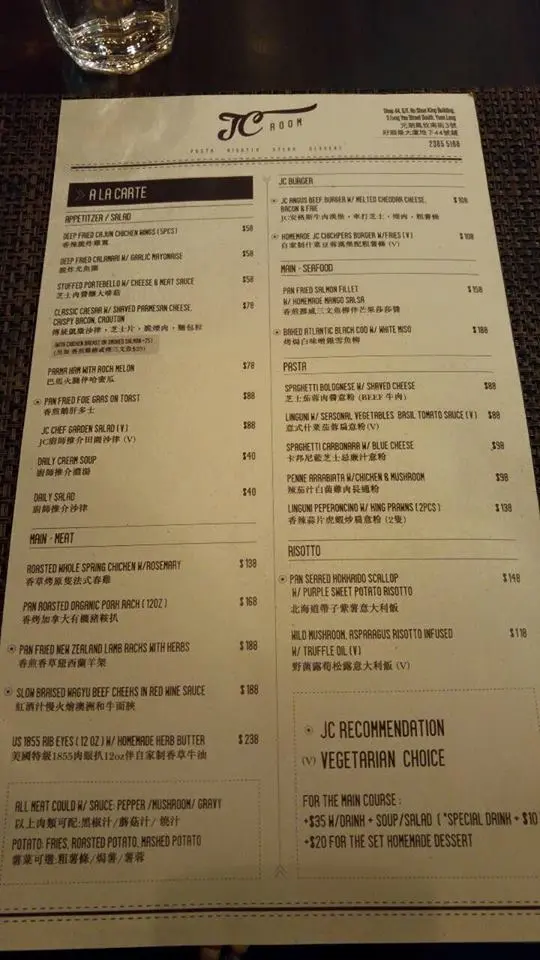 發現元朗呢排開左好幾間新西餐廳,星期日晚上諗住試一試。由於係星期日,怕太多人唔想等位,所以碰碰運氣打電話卜位。可能小店係元朗區都仲係新,即日中午打電話去卜晚上8點兩位都卜到。晚上於用餐時間跟住openrice既地址去搵,原來JC Room 係承接了Chef's Stage 舊鋪位。去過Chef's Stage既都知道鋪仔細細,只容納到12人。不過好在晚市用埋格離茶記個鋪位,叫做多番d位。格局裝修同舊chef 無咩大分別,如果爆場都會坐得幾迫。唔講以為餐廳只係改左名做jc room, 係同一個老闆營運XD經過好奇心查證後,唔係同一個老闆黎咖!! 職員都好NICE, 第一時間比MENU同水。麵包籃落左單之後會有麵包籃送上。有脆脆麵包條同小方包,小方包有少少莓乾,兩者一脆一軟熟,配上咸咸地既芝士醬,喚醒味覺。食完個二人份量麵包籃,職員會主動問你要唔要refill麵包,麵包係好味,不過要留肚食main course。餐湯點主菜加 $35可配餐飲+餐湯/沙律,加$20可配menu上各甜品一客。是日餐湯有兩款,我地加左一個煙肉豆蓉湯。湯比較厚身,有質感,啖啖都食到煙肉碎同豆蓉夾雜其中,味道唔會偏咸,亦唔會似一般忌廉湯太膩,兩個人share一碗份量岩岩好,因此個碗都幾大。沙律$88menu上有3款沙律,除左基本既凱撒沙律,仲有jc chef special salad & daily salad。jc chef special salad $88 ;daily salad $40。 我問職員兩者分別,前者用料比較豐富,亦用上了house dressing,份量亦較多。既然第一次光顧,當然要試house salad。果然不失house salad的期望。用料的確很多,香橙柳係成個沙律帶酸既食材,非常refresh。數得出既食材仲有松子仁,日本蘿蔔,芝士粒,車厘茄,青瓜,黑橄欖,沙律菜等等。dressing微酸,質地較為流質。份量足以滿足比較鍾意食沙律既我倆,其實都夠一般3-4人普通量。餐牌上有打星星既廚師推薦食物,而每類食物都有一款素食,包括burger,非常user friendly。第一次麻,當然食下打星星既廚師推薦食物。薯蓉伴羊架$188甘多款肉類之中,我最喜歡食羊。伴碟可選焗薯/薯條/薯蓉,而醬汁可選黑椒/蘑菇/燒汁。我地點左7成熟,蘑菇汁薯蓉羊架。一上菜已經暗暗地讚,因為除左點選既蘑菇汁,廚師仲比埋薄荷jelly。出面好多餐廳跟左點選既汁就skip左無比薄荷jelly,要再問先有...不過如果有埋英/法芥末就更加豐富。薯蓉的確出色,奶白既顏色,好creamy好細滑,份量少少,唔會用薯蓉黎塞飽你。一碟主菜既羊架,有4支骨,份量十足。廚師以每兩支骨甘煎。表面煎得香口,切開有微微血水滲透整件羊架。兩支骨既羊肉有一定厚度,但廚師很出色地展現了7成熟。不得不讚,肉質很嫰,把扒刀亦非常好切。意大利飯$148另一個主菜都係點左打星星既廚師推薦 -- 北海道帶子紫薯意大利飯。jc room 既主食 (飯/薯蓉) 普遍偏少,如果食澱粉質為主既朋友可能覺得唔夠食。但我晚餐食澱粉質既份量比較少,個人覺得份量倘可接受。顏色非常奪目! 加上兩大顆珍寶size既帶子,未食先赢得掌聲!! 老實講,紫色既意大利飯唔係太食到紫薯味道,個人認為紫薯應該帶甜,如果飯可以再甜少少會更好。飯混合左d菇類,比較爽口,同飯既口感形成對比。但飯質稍為偏硬。珍寶帶子煎得非常好食,表面香口,內裡係半熟既感覺,鮮甜。即磨熱咖啡餐飲無轉特飲,只係點左即磨熱咖啡。有即磨咖啡既水準,但個比較喜歡有熱奶泡的咖啡。老師娘解說奶係咖啡專用奶,唔係普遍鮮奶,打成熱奶泡無甘好飲。然而奶係幾滑既。伯爵茶焦糖布丁跟餐加$20可選餐牌上既甜品。伯爵茶焦糖布丁,布丁好滑,唯茶味可以更濃。是晚共$527/2人…Read More