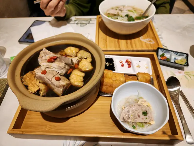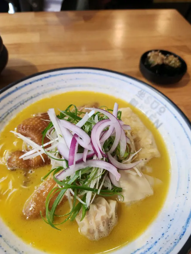 綿綿魚肚雲吞黃金雞湯麵套餐$112家住大西北,出開深水埗,專程搭車嚟土瓜灣為無味精雞湯麵而來.今日黄昏未夠6點坐低,時間尚早,店內加埋我地兩檯客.湯底比想像中不是很重雞湯味,飲落無味精,味道不錯.雞係雞脾位很滑但皮很肥,唔多皮又唔滑既我理解.雲吞肉有點實,一塊魚肚,以這個價錢完全收貨。手打香水檸檬茶夠清香👍前菜漬青瓜幾醒胃,兩件比較細小😝鹽燒鳳梨配黑醋牛油果雞胸沙律$72勁多沙律菜,黑醋是主角嗎?黑醋勁重手,直頭落到燴湯咁