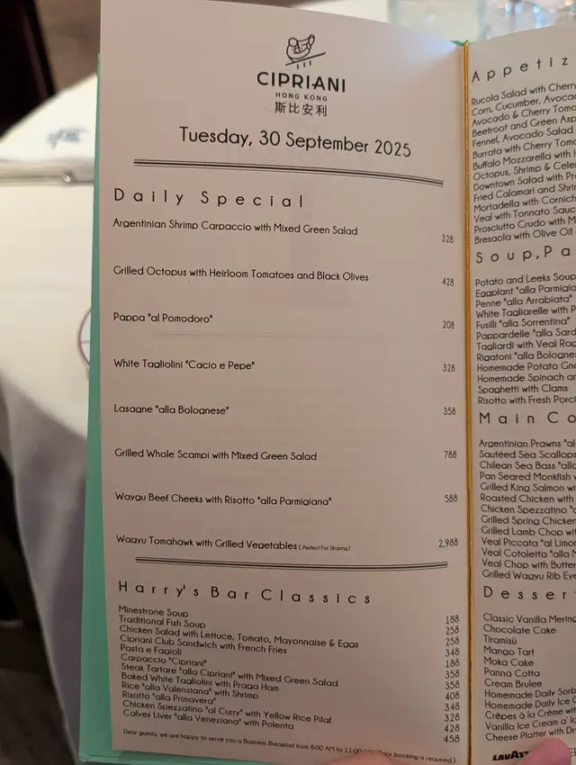 🍽 餐廳:Cipriani📍 地址:中環德輔道中2A號中國銀行大廈12樓⏰ 營業時間:星期一至六 8:00 am - 11:00 pm(實際時間以店家公告為準)💡 建議:👉 會員制且需要提前訂位,避免錯過窗邊景觀位👉 想感受正宗意式生活美學,可以直接選擇Harry's Bar菜單內的菜式 🗺️ 經典義式風味Cipriani 來自威尼斯,全球多個城市設有分店,香港店坐落於中銀大廈12樓,是一間只接待會員的高端私人俱樂部意大利餐廳。餐廳裝潢結合深色木材及典雅英式復古風,氣氛高雅,經常接待外賓政要,吸引高端商務族群,高挑玻璃窗外就是中環城市景觀。環境寬敞、服務細膩,非常適合商務或朋友聚餐。Cipriani的餐單會標示今天的日期,列出以經典傳統菜式為主的菜色,融合經典意大利傳統與高端食材,突出正宗意大利風味,呈現簡約而高雅的意式料理。菜式注重食材新鮮與簡單調味,強調「Less is more」的烹飪哲學,讓食物原味得以突出。值得一提的是若想試原店或經典菜式,那可以考慮直接從Harry's Bar菜單內選擇,它是Cipriani品牌精髓,承載著威尼斯原店的歷史和經典意大利美食傳承,每一道菜不僅味道出眾,更蘊含文化故事與待客之道,真的不能錯過。1️⃣ Minestrone Soup $188 份量適中,湯底清澈帶蔬菜甜味,豆類與時令蔬菜燉煮至釋放鮮味但不會碎爛,帶出義式家常感。2️⃣ Baked White Tagliolini with Praga Ham $408 招牌必點!Cipriani的Tagliolini(細寬蛋麵)是一款經典的意大利蛋麵,在Harry's Bar的招牌做法中,意粉會和火腿拌炒後,淋上奶油和帕爾馬芝士、白醬(Béchamel)製成濃郁醬汁,讓意粉裹住醬汁後入口香滑,表皮則因烤焗而帶有金黃微脆的口感。這道菜融合了意大利傳統精緻製麵技巧與經典燒烤手法,口感豐富,味道層次分明,是Cipriani標誌性經典菜肴。3️⃣ Crème Brûlée $168 焦糖層脆口香甜質感細膩,入口脆聲清脆,燉蛋滑嫩細緻,奶香均衡不過甜,使用了天然雲呢拿籽,口感層次豐富且經典純正。🥂 餐廳整潔、氣氛及服務整體環境優雅,帶有濃厚的歐陸氛圍,適合正式場合或約會;座位間距舒適,不顯擁擠。服務人員態度專業親切,能提供合適的酒類與餐點建議, 有外套的話餐廳會幫忙掛起,客人會收到匙牌,走的時候亦會主動歸還外套,非常貼心。🗺️ 交通方式|How to Get There🚇 港鐵中環站 J2 出口,步行約 5 分鐘可達中國銀行大廈,乘電梯直達 12 樓,有一部只到11樓,留意不要搭錯。…Read More