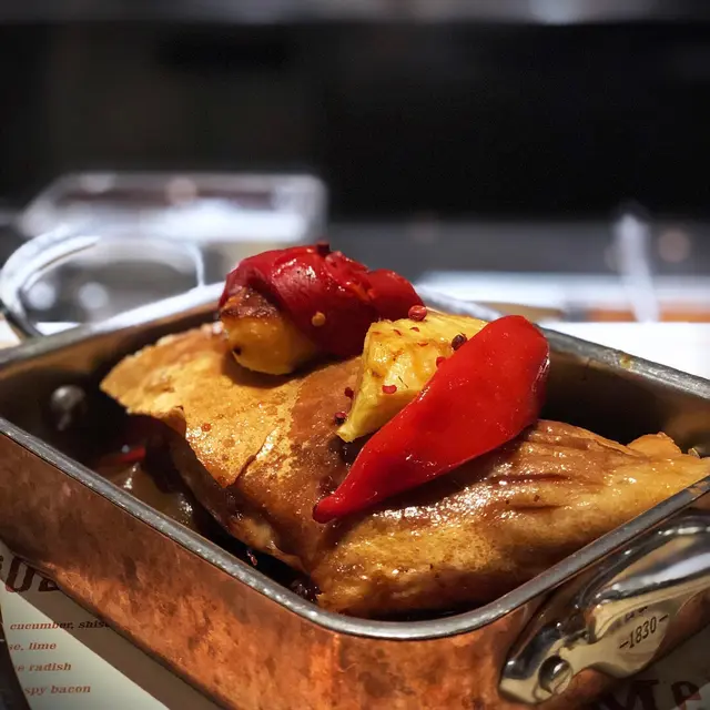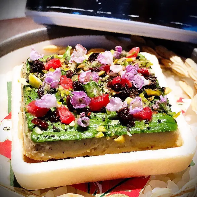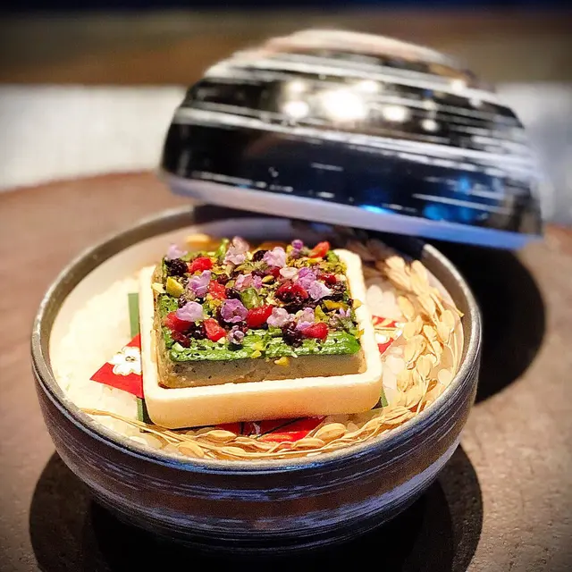 Foie Gras Pistachio Raspberry Whisky Jelly Monaka What a beautiful edible garden !!! Colourful flowers and raspberry on top, with pistachio paste as the grassland, the silky, rich and melting taste foie gras mixed with whisky jelly as the soil and the traditional Japanese monaka (waffle made by rice) as the fence .... totally a piece of arts !!…查看更多