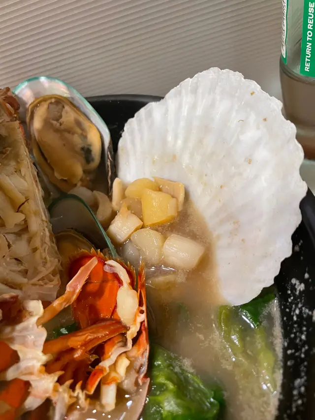 今日天氣好凍,收工又餓又凍,好想食d熱呼呼既晚餐,途經一間排長龍既龍蝦湯泡飯,本住香港人排長龍就一定好既精神,一於照等差唔多排到,老闆已經比餐牌我地落單。我地揀左個套餐《極上海鮮龍蝦湯泡飯》&《鮑魚花膠蟲草花雞煲翅》,小食《黑毛豬片平豬肚尖》。一上枱我地都嘩嘩聲勁大份勁足料,龍蝦湯真係有鮮味,入面仲有蜆、青口、帶子粒;花膠雞湯入面有翅,鮑魚、花膠、蟲草花、同半隻雞!勁好飲,我地飲左一大半先泡飯,但都已經飽左一半兩個湯都好濃郁,仲要冇加味精超正黑毛豬肚尖都好正,又爽口仲要厚切,啖啖肉,再配埋村。爺爺秘製辣椒豉油,好野味最後,我哋叫咗兩杯餐飲,《熱情果梳打,菠蘿梳打》係用玻璃樽七喜沖既,大大杯,飲完gur 口哂埋單先每人二百蚊左右,性價比高,可以一試…Read More