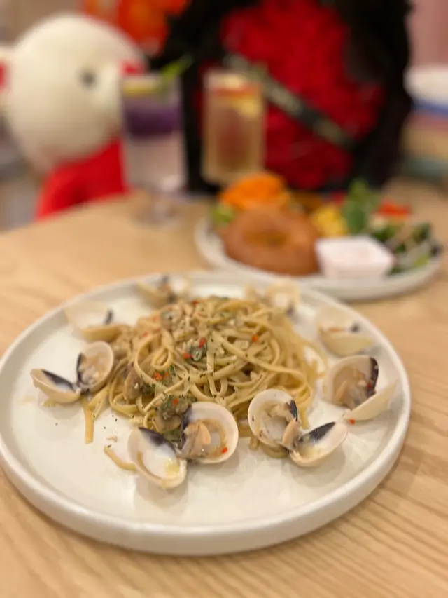 貝果外脆內煙韌,煙三文魚鹹香十足,搭配清爽青瓜片同Dill Cream Cheese,味道層次豐富,套餐仲包溫泉蛋,烤南瓜、沙律菜,整體豐富有營養!🍝 蒜香蜆肉意粉