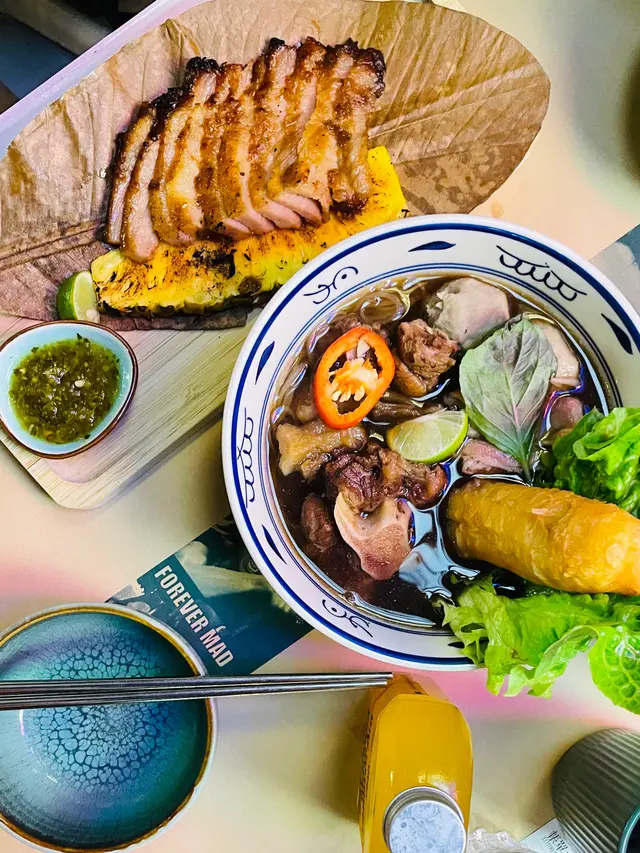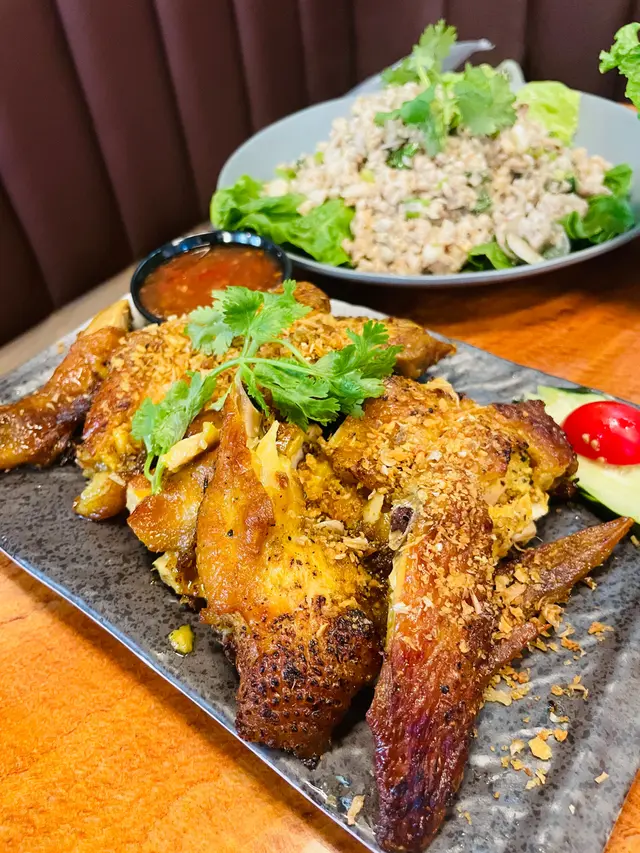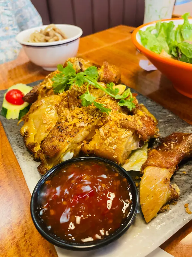 熱辣辣嘅燒雞~外皮好脆!好juicy!好入味!好值得叫!#泰式船麵(豬肉)湯底好濃!但我其實唔係好識分越南河粉同船麵感覺好似🤣但啲麵索哂湯好正!#肉碎生菜包每次食泰國菜都好鍾意點呢個