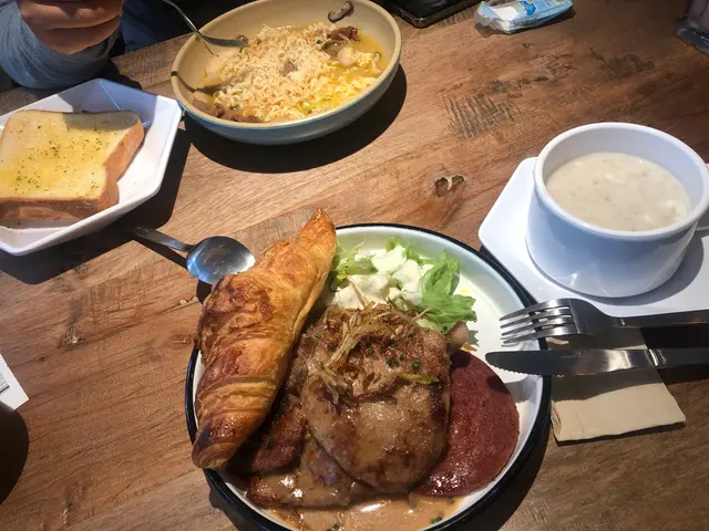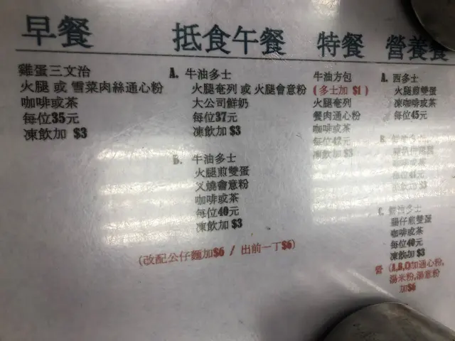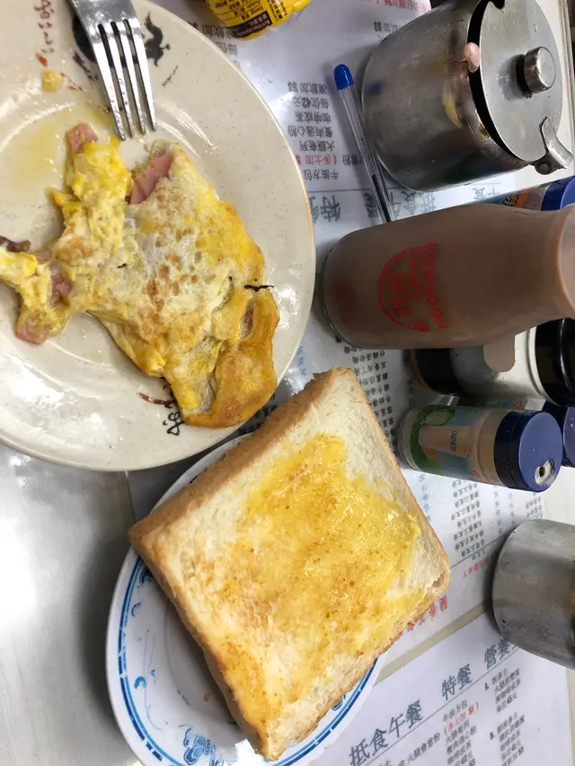 假日早餐,幸好1130前趕到,餐牌無影,外賣紙👆🏻👆🏻每張枱都放了礦泉水賣👆🏻$34沙嗲牛肉(份量較少)+3蒜香多士👆🏻$46香煎豬扒配餐肉,炒滑蛋*豬扒份量較細*餐肉幾脆口*特別之處炒蛋底下有薯蓉+$3轉牛角酥👉🏻正常+$6無糖鮮奶燕麥片👉🏻健康咪道,無糖味,及無牛奶味+$3西式凍檸茶不用收加一的早餐,偶然吃也不錯。…Read More