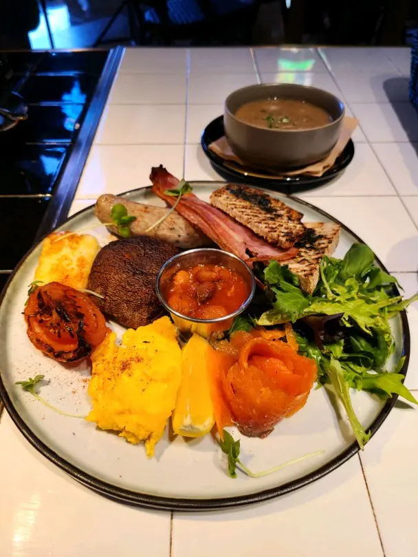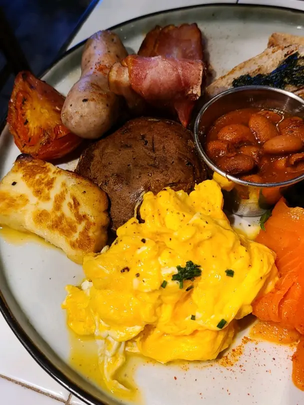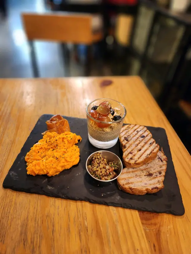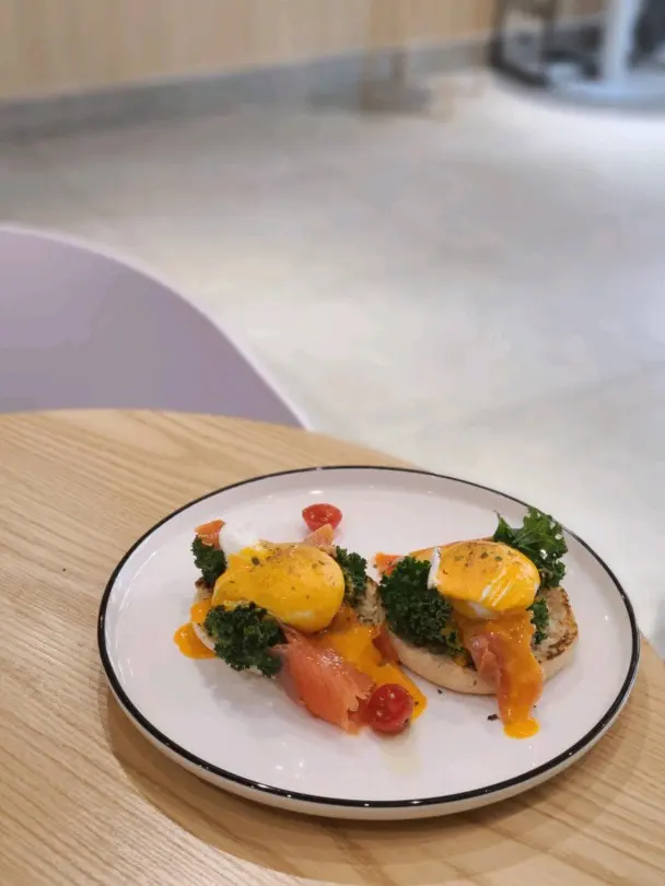 精選早餐 (走cream cheese)炒蛋份量足,蛋味濃,煙三文魚不太鹹。加$3轉奇亞籽杯,toppings 有提子和藍苺😋。整體來說味道幾好,蛋白質豐富,健康。