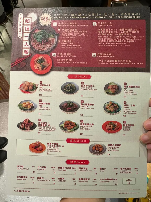 放工同朋友嚟旺角搵食,呢間鋪面乾淨企理,落單好快有得食。一人餐酸辣小鍋米線(湯)$78湯底酸辣開胃,辣度可以自選,對於唔係食太辣嘅我,BB辣岩岩好夠。配料唔少,食到最後都夠料。跟餐有小食,叫咗拍青瓜,清爽解膩麻辣手撕雞飯 $63雞肉好多,肉質嫩滑,麻香夠,唔算太辣,幾好食藤椒魚皮$28幾欣賞滕椒嘅麻香,魚皮爽脆,好開胃🤤椒鹽雞軟骨$28小食必點,炸得香脆唔油,椒鹽味香炸饅頭$25呢個有驚喜,外皮脆,入面鬆軟,面頭有煉奶同埋朱古力醬,非常欣賞👍埋單$222,兩個人食到好飽,以旺角區嚟講都算抵食。…Read More