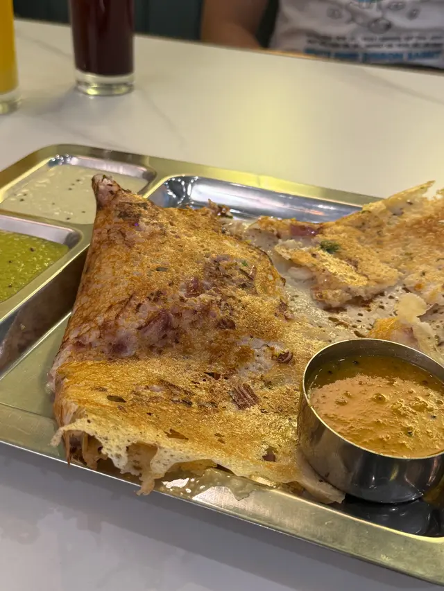 朋友超鍾意食印度菜,上網睇到有素食嘅印度菜,專程嚟try try佢。餐廳環境寬敞,感覺乾淨舒服,侍應親切有禮,會主動介紹菜式。Ghee Onion Rava Masala Dosa $95印度薄餅外脆內軟,餡料有洋蔥香同薯仔泥,配埋三款醬汁,味道層次分明,非常正宗。Masala Kulcha/Garlic Naan $45試咗兩款唔同嘅餅,蒜香naan熱辣辣,麵包鬆軟,夠香口。Kulcha相對地脆口少少,配咖喱汁亦一流。Gobi Mushroom Fry $80蘑菇同椰菜花配埋酸酸地嘅醬汁,內裡保持嫩滑,幾有驚喜。Mango Lassi $55食親印度嘢都要飲嘅芒果乳酪飲品,酸酸甜甜,飲落清新Liver Cure $40一杯清新嘅特調飲品,紅菜頭汁飲完感覺好健康。整體嚟講好滿意,食物口味正宗,材料新鮮,選擇多。推介比鍾意印度菜或者想試素食嘅朋友…Read More