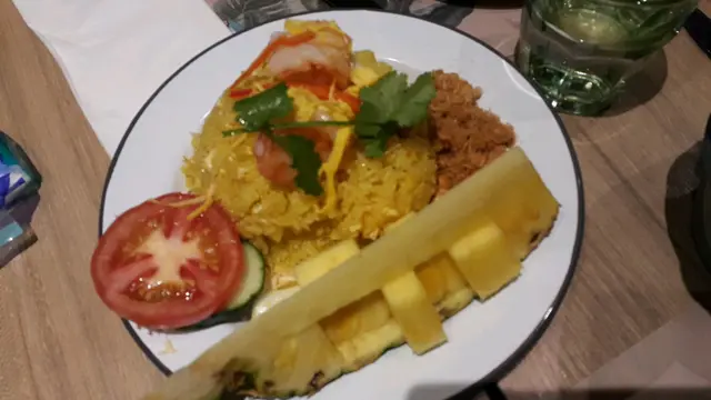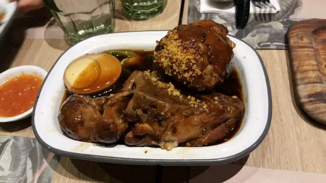 行行下太古城突然想食泰國嘢,於是就去左這間鋪頭,排左10分鐘就有位。order左6樣餸。第一樣,泰式鹵水豬手,價錢$98。豬手嘅肉質好嫩滑,淋到唔駛咬都得,而且幾入味。第二樣,脆皮烤乳豬,價錢$198。乳豬皮脆口,肉都軟熟,泰北醬都幾特別。第三樣,波羅海鮮炒飯,價錢$108。蝦都大隻,波羅大粒,飯炒得適中。第4樣,串燒,價錢就唔記得。味道就跟其他泰式餐廳差不多,ok。第5樣,芒果樹黃咖喱炒蜆,價錢$148。咖喱入味,如果配埋麵包就正。第6樣,袖子沙律,價錢$98。這個就一般,可以唔叫都得。…查看更多