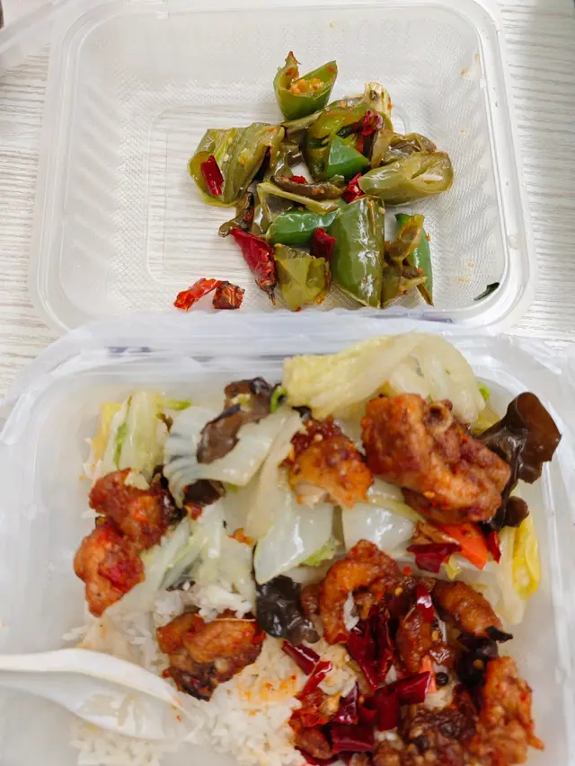 唔多講,過份程度一睇相就知。係咪以為我叫左三餸?張相係乜都未食之前影嘅,特登攤開晒d雞出黎,雞皮都有幾塊,雖然我都食雞皮,但辣子雞,雞肉佔八成都唔過份吧~好明顯青椒比例遠高過雞肉。其實佢嗰盆辣子雞仲係一大盆,唔係餸尾。眼見佢夾俾我嗰陣見其實有好多雞肉。可能係我衰,唔即時出聲,離遠睇以為自己嗰盒除左多青椒應該都有合理份量嘅雞肉,點看一開盒真係咁過份。係我叫少飯的,唔係佢問題。不過連少飯都少到咁,得幾啖。可能又係我問題。…Read More