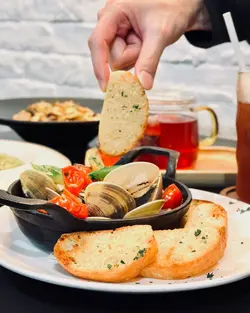 貓耳朵意粉設計凹位可以將忌廉野菌汁藏於其中,每一粒咬下,清甜濃郁醬汁隨之溢出 🤤.▶️ 花酒煮蜆配蒜蓉包 🍞