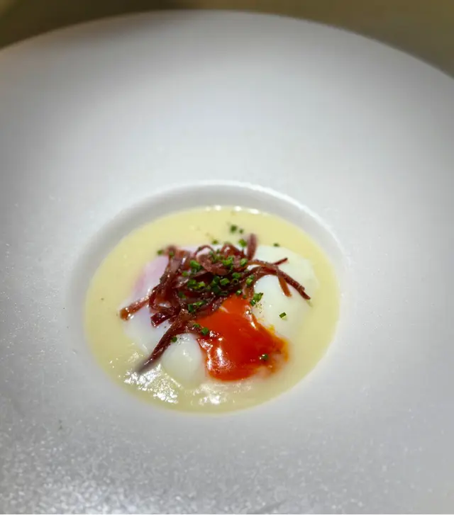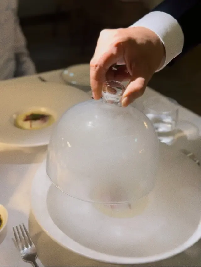 第二道菜是有些玩味,有一個玻璃罩吸住,上枱嘅時間打開有濃濃嘅煙滲出,入邊就係一個白蘆筍蓉再加蘭王蛋。