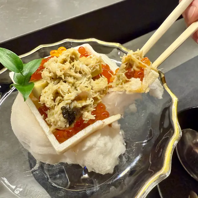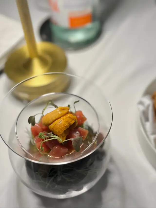 第一道菜係吞拿魚赤身加牛油果蓉,上面再加海膽。入口鮮味無窮,我覺得最主要係因為海膽非常之新鮮和甜
