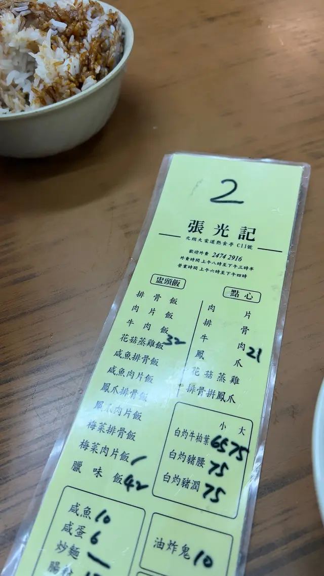 今日幫襯元朗冬菇亭嘅張光記朋友介紹話佢哋嘅點心同埋蒸飯好好食今日又係嚟到元朗覓食嘅時候見到門口都好多人排隊一坐低朋友叫咗梅菜肉片飯我就叫咗鳳爪排骨飯佢哋係倒轉吸落個碗度所以影相嘅時候唔係好影到個面有餸其實啲餸喺晒個底本身仲想試吓佢嘅臘味飯但手因為我哋今次得兩個人食,所以一人一個飯就冇特別再嗌其他野啦排骨軟熟得來有咬口鳳爪亦都好入味個飯唔太腍亦都唔硬仲有少少煙靭添講講環境,嚟得冬菇亭食嘢都係食個情懷所以唔好期望會係好好,但係都乾淨嘅我下次會再嚟幫襯,下次真係會想試吓個臘味飯呢度食嘢唔係真係食香港情懷咁簡單而啲嘢真係好好食唔係一般酒樓嘅一式一樣嘅味道推介大家值得一試…Read More