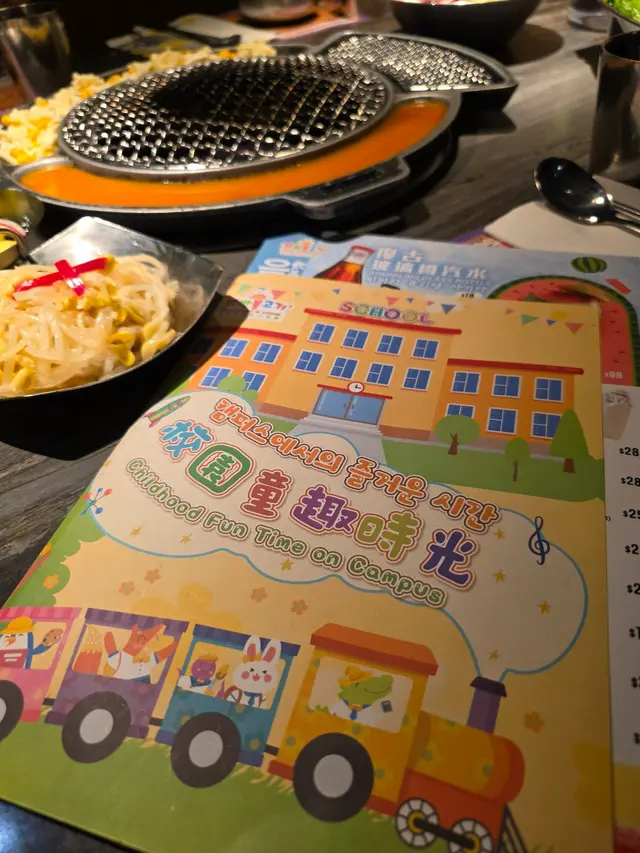 想不到韓烤都有親子餐廳,新手媽媽朋友的好介紹,這裡最大的特色是有一個很大的兒童天地,大大個波波池,還有超市 Shopping、滑梯、煮飯仔與及很多玩具,與用餐區巧妙分隔,父母能邊烤肉邊留意孩子在波波池或滑梯間嬉鬧。至於用餐區亦很有特色,包箱是韓式小屋,木質裝潢溫潤,很有特色。這次點了兒童餐「學霸小獅子螺絲粉」,造型可愛,小獅子頭頂書本,孩子說我吃了獅子,哈哈!「王者牛肋骨」重點推介,烤得外脆內嫩,肉汁鎖住,入口有輕微煙燻味,配生菜包一口,非常好味。「熟成黃油雞腿」出場造丑特別,吊着出場,這兩味菜可以請工作人員燒烤,火候剛剛好。另外又點了「荔枝牛肉串串」牛肉粒裹上荔枝果香醬汁,甜中帶鹹,增添夏日清新感。「壽喜燒牛胸腹」燉煮入味,牛肉片薄嫩,湯汁濃郁卻不膩,配米飯正好。「生日牛肉蛋糕」設計獨特,慶祝時刻格外有趣。飲品方面,玫瑰佛手柑梳打、菠蘿梳打,最後孩子玩遊戲,還贏了一個「窩心摩天輪小吃」,像個轉動玩具,載著小份薯條和年糕,孩子邊轉邊吃,增添互動樂趣。整體來說,這裡的環境讓親子時光更愜意,菜色融合韓式風味與兒童喜好,份量適中,不會吃撐。適合帶小朋友來放鬆,略帶創意的擺盤讓用餐變成小冒險。…查看更多