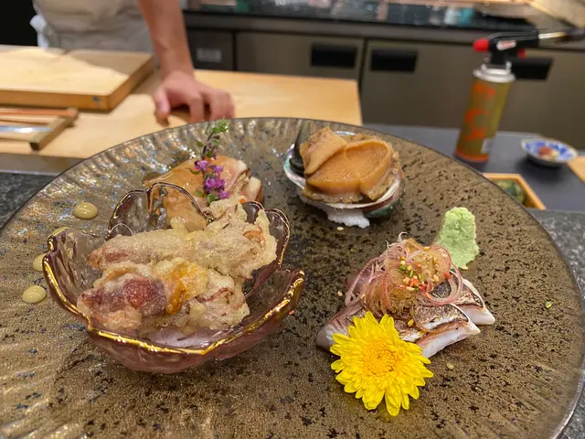 為與老婆慶祝周年紀念,所以訂了元朗這間Omakase的lunch set。總共有12道菜(未包甜品),由於上載相所限,所以前菜、麵豉湯和甜品(柚子雪芭和抹茶豆腐凍)未能用相片交代,但確實出色👍🏽👍🏽第一道:鮮蝦沙津配和風柚子汁第二道:黑松露蟹肉茶碗蒸第三道:火炙鰆魚,螢光魷魚炸物,汁煮鮑魚,油坊主刺身第四道:鮮帶子壽司配青柚子第五道:火炙鰈魚壽司第六道:深口池魚壽司配柚子胡椒第七道:中拖羅壽司第八道:鮮銀鱈魚壽司配鱈魚子加沙律醬第九道:北海道馬糞海膽配燒紫菜第十道:鮮鯖魚壽司第十一道:蝦鍋巴配濃蝦汁第十二道:左口魚邊油魚生飯每一道菜,師父都一一解釋選材的原因和特色,令客人可以品嚐到菜式的美味。味道非筆墨所能形容咁好味,想重點介紹師父很親切和友善,言談間帶點風趣,沒有架子。整頓飯很圓滿,性價比極高,每位都是$6XX,值得光顧。…Read More