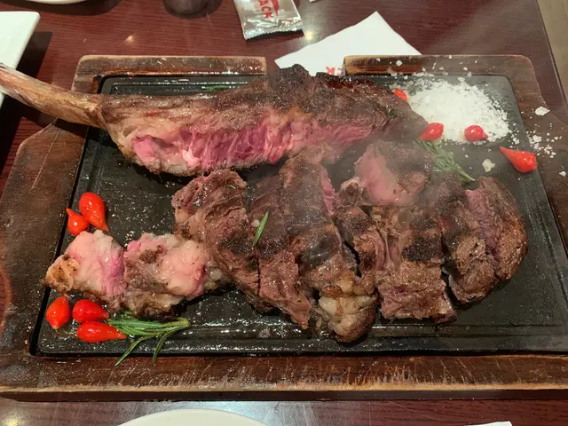 店内空间很大,座位与座位之间隔得比较远,坐得很舒适,食物方面,人多的话,建议点套餐,抵食,点了个4-5人套餐,1600左右,含有战斧牛排,战斧牛排单点要1000多,又大份,肉质很嫩,洋葱圈炸得很漂亮,像一朵花,不过吃不完,太多,总体比较推荐高质…查看更多