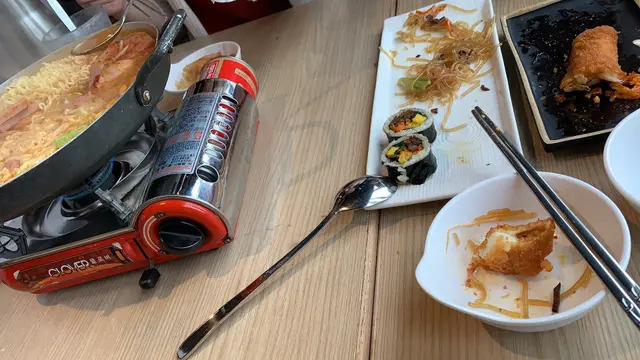 过来这边,随便找的这间,点了烤牛肉紫菜卷,好好食啊,还有部队锅,就比较中规中矩,份量挺大的,还有一条泡菜炒饭的芝士棒,都OK,脆脆地,芝士也比较足料,不过柚子茶一杯20元唔抵咯,就用柚子蜜冲水的而已,而且什么装饰也没有…查看更多