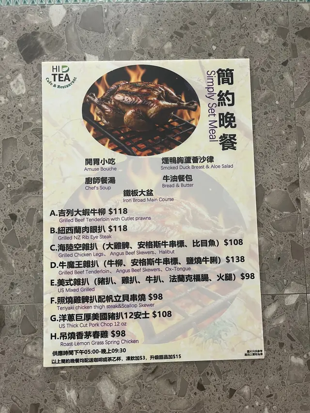 咁啱要去開新蒲崗附近嘅工廈上堂,就隨意入咗一間望落唔錯嘅茶餐廳,一入到去光線都好足,餐廳內部比想像中大😮一坐低店員就大力推薦簡約晚餐,我哋就每人叫咗一份🤣上菜速度非常之快,我哋回過神來,已經發現成張枱都係食物🤣開胃小吃有醃蘿蔔、酸青瓜、木耳~廚師餐湯今日嘅餐湯係羅宋湯~煙鴨胸蘆薈沙律+牛油餐包清新嘅前菜,入邊有唔同款嘅沙律菜、青瓜、燒鴨舖,最驚喜嘅真係蘆薈粒!完全做到點睛之用,超抌本!吊燒香茅春雞 ($98)一上菜忍唔住哇咗一聲!🤩第一次試呢一類真係掛住嘅燒雞,入邊落足香茅同埋其他配料例如洋蔥粒、蔥等等,超惹味!!戴上手套之後就可以「手撕雞」,份量比想像中多,之後食唔晒都唯有打包🥲食落去香茅味十足,雞亦都唔會太嚡,真心好高質!性價比超高!仲可以生菜包肉食添!海陸空雜扒(大雞髀、安格斯牛串標、比目魚) ($108)有齊晒我鍾意食嘅肉🙂‍↔️牛串標煎到四成啱啱好,超軟腍,同時不失肉味🤩比目魚煎得啱啱好,唔會太乾🤔雞髀就相對上失色少少,比較乾身,同埋可能因為有春雞做比較,雞肉相對上嚡啲🫣