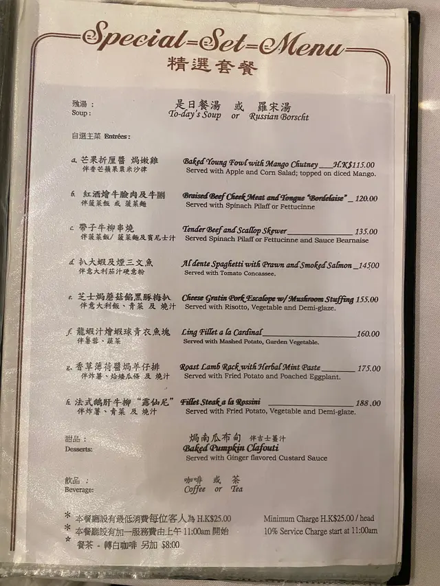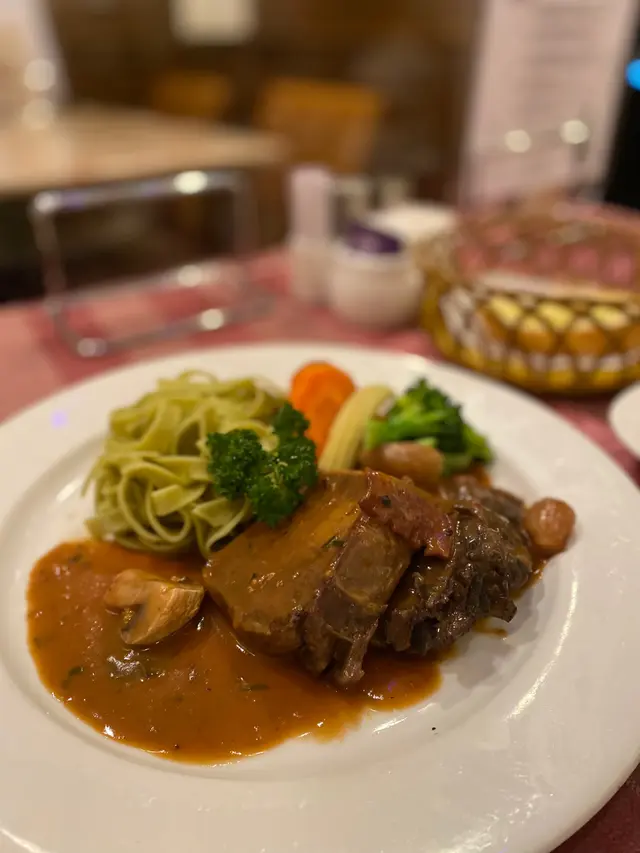 懷舊西餐嘅裝修,加埋店員熱情款待,覺得比人一種好溫馨嘅感覺。☺️食物選擇幾多,有套餐亦有單點。我同朋友今次就嗌左B同埋G餐試試。首先送來餐湯同埋蒜蓉包,羅宋湯好足料,夠曬入味。🍽B: 紅酒燴牛臉肉及牛脷紅酒汁好香紅酒味,牛脷亦煮得好淋。🥰🍽G: 香草薄荷醬焗牛仔排羊煮得剛剛好,唔會太肥亦一啲都唔酥😋最後甜品係焗南瓜布甸拌吉士薑汁。總括黎講,對於呢到嘅食物、環境、服務質素和性價比都非常滿意,作為有budget 嘅慶祝dinner 都唔錯!🥳…Read More