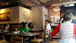 由於台細細, 店員見我地d蜆湯未捨得俾佢收, 就即刻好親切咁拎左個架出黎放碟意粉上去--又有趣又鏗位!! 同埋都好細心咁同我地講廚師而家預備緊我地既魚, 等我地耐心等候, 好窩心