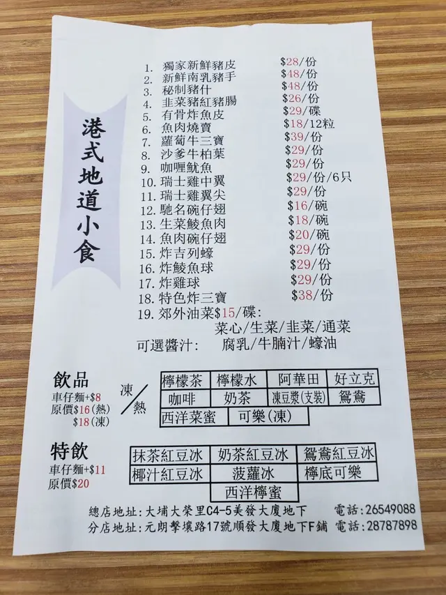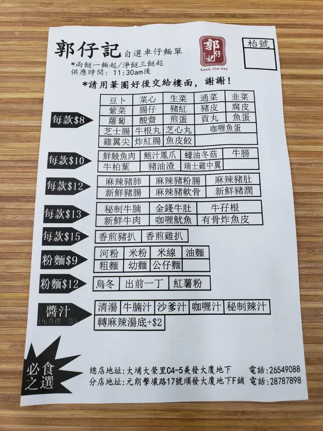 有時喺元朗真係唔知有乜好食,今日一落巴士就見到有車仔麵舖新開張,叫<郭仔記車仔麵>,平平地又一餐即刻同個friend入去試下。晏晝點零鐘鋪頭入面都擠滿咗人客,好彩有張卡位啱啱離座,我地兩個可以唔洗搭枱啦yeah~自選車仔麵畫紙落單,價錢分類做得好清晰,除咗啲招牌款式之外都仲有好多款特色小食,價錢公道都好大眾。而家仲有啲新張優惠,八寶麵只係賣緊$38蚊,仲要送埋嘢飲添。我朋友叫咗碗油麵,佢揀咗呢幾款餸:新鮮豬腸+鮑汁鳳爪+魚皮餃+通菜,另外加秘制辣汁。佢話啲新鮮豬腸好正,洗得好乾淨,一啲白色肥膏都冇,鮑汁鳳爪我就不敢恭為喇,我一向都唔鍾意食腳趾其他餸菜都正正常常,魚皮餃有三隻,通菜好鮮綠,夠爽口。而我就叫咗碗幼麵,餸就揀咗魷魚+咖哩魚蛋+豬皮+蘿蔔同埋紫菜,落咖哩汁。最正就係啲蘿蔔,煮得好夠腍,冇渣又清甜,豬皮仲好食,吸晒啲咖哩汁...啱哂重口味人士,咖喱陳皮魚蛋係我嘅至愛,口感豐富夠哂濃味,另外魷魚都夠彈牙,唔錯唔錯…Read More