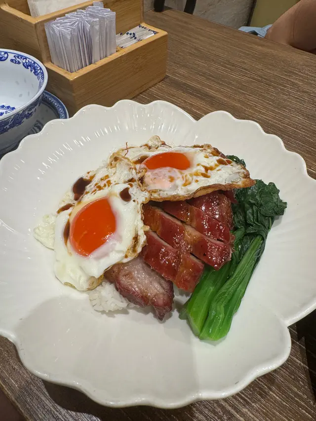 今日終於試到非常之出名嘅發達叉燒,喺灣仔名店,一到食飯時間即刻排晒隊,今日我哋都等咗15分鐘,好彩非常之值得✅✅老火例湯 每一個飯都有一個老火,例湯每日新鮮熬製、用大量食材慢火煲3-4小時以上,湯底清甜濃郁,無味精、飲落暖身又滋補!叉燒雙蘭王蛋飯 叉燒配兩隻流心蘭王煎蛋,叉燒香甜多汁、肥瘦均勻,蛋汁撈飯超正,性價比高。而且食到豬肉嘅甘香。💪💪茅台醬油雞燒鵝飯 用茅台酒同高質醬油醃製三黃雞,雞肉嫩滑、雞皮爽彈,有淡淡酒香,燒鵝外皮脆口、肉質結實,二選一或雙拼都得,碟頭飯份量足,每客送例湯。🔥🔥鵝汁時蔬 濃郁鵝汁,灒落灼熟時蔬如菜上,蔬菜鮮甜帶獨特鵝油香,簡單但好味又有營養。…Read More