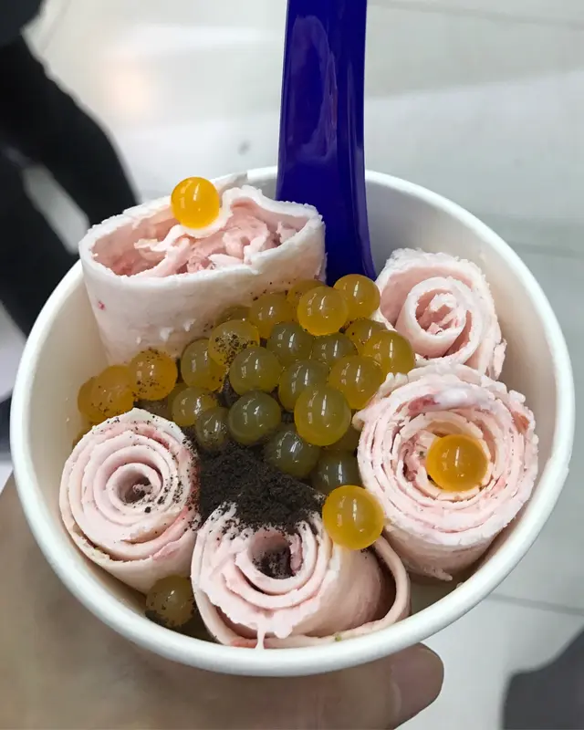 一直都想試吓啲炒雪糕,今次嚟到葵涌廣場,無意中發現咗呢間小店。呢度啲炒雪糕可以自行配搭口味同配料,加入雪糕一齊炒嘅配料有Oreo同阿華田餅,都幾得意。自己唔想太甜最後揀咗白色雲呢拿加士多啤梨做炒嘅配料。店員好快手就將士多啤梨打碎,同雪糕混合埋一齊,然後將變硬咗嘅雪糕卷成幾卷放入紙杯,灑上其他配料,賣相吸引嘅炒雪糕就大功告成。粉紅色嘅炒雪糕卷到好似一朵朵玫瑰花,好特別,女仔見到一定好鍾意。