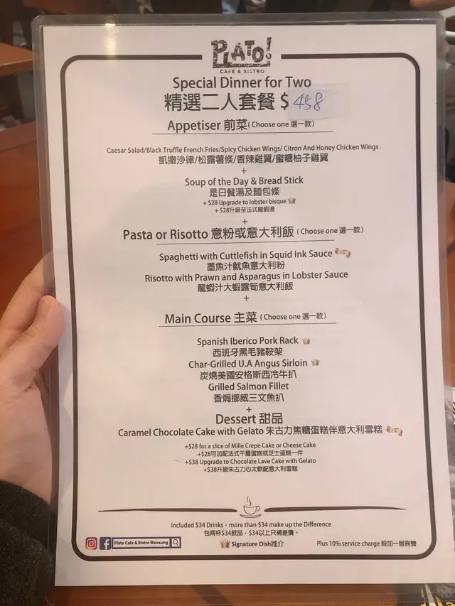 前幾日白色情人節同發Gor嚟咗佐敦嘅Plato Cafe & Bistro撐枱腳,係呢啲節日最好book定位,咁就唔怕等walk in排隊😁 佐敦呢間分店係地鋪,空間環境好大,坐得好舒服。我哋叫咗個精選二人套餐 $458,除咗有主菜+意粉/意大利飯之外,仲會有前菜、餐湯及麵包條,最後仲送餐茶同甜品,都幾豐富。🔹 龍蝦汁大蝦露筍意大利飯賣相擺盤好靚,遠距離都聞到大蝦嘅膏味,大蝦size算大隻厚肉,啖啖肉,正👍 意大利飯粒粒分明,龍蝦汁滲入飯之中,都算幾惹味,如果龍蝦汁再重多少少味會較好😋 🔹 炭燒美國安格斯西冷牛扒發Gor要咗五成熟,牛扒厚身又大塊,肉質算嫩滑唔會韌。🔹 松露薯條熱辣辣薯條份量都算多,松露粉雖然眼見唔算多,但食落都幾夠味。🔹 朱古力焦糖蛋糕伴意大利雪糕甜品一上就已經心心眼😍 底層朱古力焦糖蛋糕唔太濃朱古力甜味,所以配搭埋cream加雪糕一齊食就好match,而且唔會甜得濟!好味到想encore多個甜品🤤📍Plato Cafe & Bistro 佐敦吳松街186-188號地舖..環境分數:8/10食物分數:7.8/10Encore分數:7.8/10…Read More