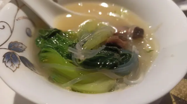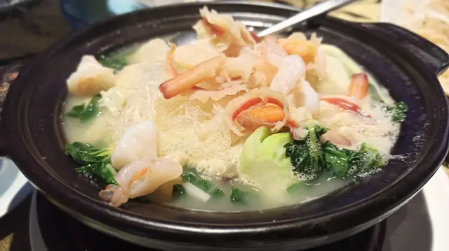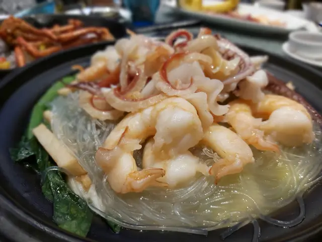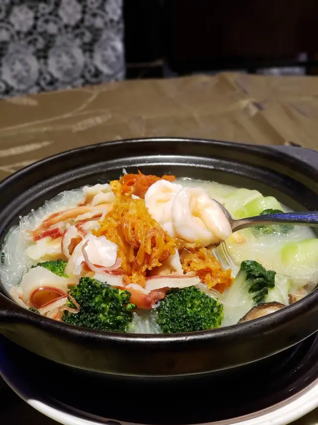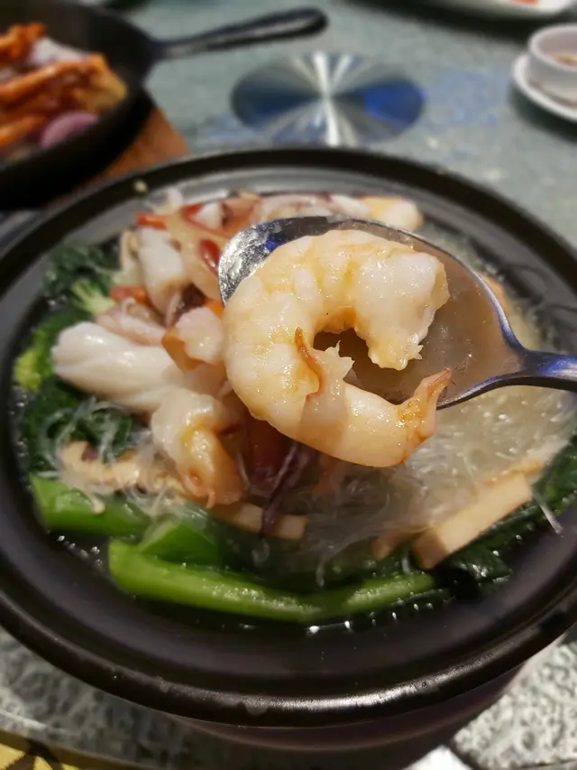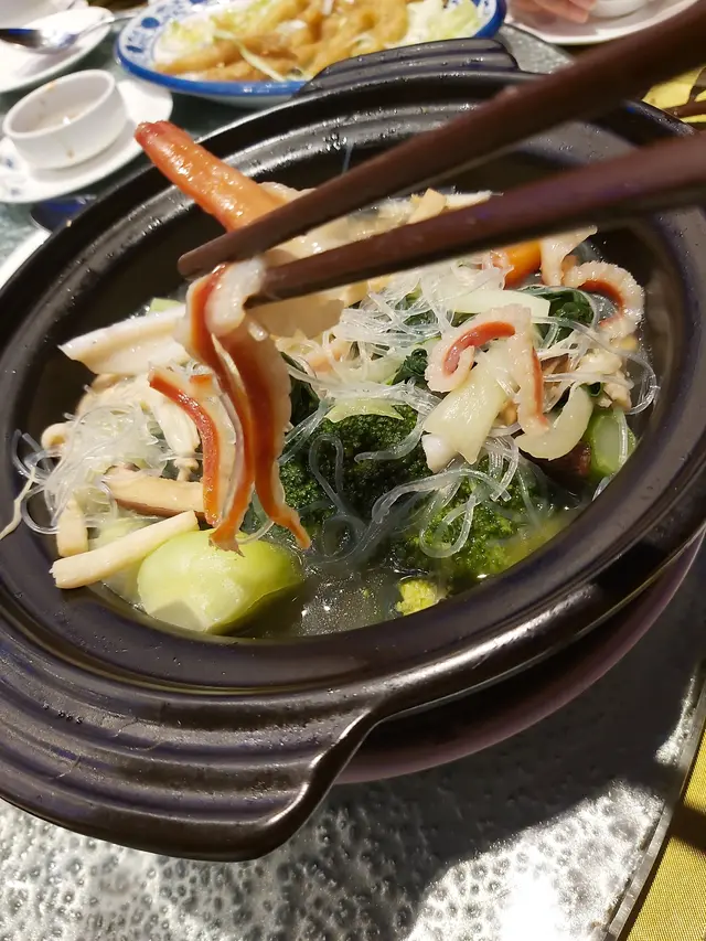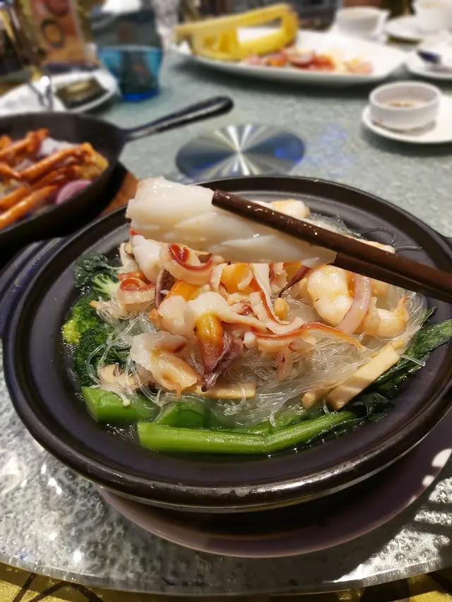 家中大廚要往石門覆診 ,今晚無暇煮飯,我便提議到附近的星海薈,剛好與診所一街之隔, 由石門站出發, 亦只需步行五分鐘。進入酒樓主廳已被天花的波浪形扭帶裝飾吸引,配合燈光折射,彷如置身一道紫色星海,閃亮璀璨,中間還設有婚禮台,別緻花卉裝飾配合溫暖燈光,氣氛浪漫。侍應還為我們預備一盤熱水及夾清潔餐具,自然食得放心。除了特別推介,晚市套餐選擇也不少。【小食 $20】黑木耳大小適中,一口一顆,口感爽脆,混入酸醋汁,味道酸甜醒胃【鐵板白胡椒煎焗澳洲龍蝦 $598 】上一次在觀塘分店吃過這款菜,質素不俗,今晚當然再 encore。澳洲龍蝦約半斤重,以鐵板奉上延續熾熱溫度,侍應即席在客人面前淋上白胡椒汁,香噴噴的味道隨熱力四散。已預先破開的龍蝦殼,露出飽滿結實的龍蝦肉,入口脆滑爽實,味道鮮甜,白胡椒特點在於微辣兼且 有一股誘惑的辛辣香味,沒有黑胡椒那股刺激嗆味,暖胃得來亦是發揮海鮮鮮味的功臣。【星海薈小炒王 $168】話明小炒當然夠鑊氣, 用料非常豐富:有白飯魚乾、大蝦球、魷魚、韭菜、紅、黃椒、蝦乾、 榨菜絲 ,還有絕不能少,爆炒後份外甘香的腰果;味道包羅萬有,味鮮兼口感豐富,喜歡樣樣有的朋友不要錯過。孖寶配搭 $ 298【蜜汁手切黑豚肉】厚切叉燒咬起來具質感,用上梅頭肉,肥瘦均稱,肉質細緻、嫩滑得來又有嚼勁,帶少許燶邊的位置最可口 ,配合質地杰身,清香少甜的蜜糖汁,更為滋味【三鮮海皇什菜煲 】砂鍋盛載保溫又美觀,鋪滿海鮮,非常吸引, 有新鮮珊瑚蚌、大大粒爽脆蝦球 、冬菇片、西蘭花、小白菜,貝片等,湯底奶白鮮甜, 粉絲吸滿上湯,可口彈牙, 可謂一道健康又老少咸宜的菜酒家位處酒店內,無論環境、出品、服務均有相當質素,聚餐或婚宴是個不錯的選擇茶介$18 / 位 …查看更多