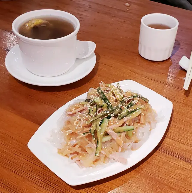 天熱,身燥,心煩。自觀已無須過多肉類以供身體能量所需,亦為免情緒易於高漲有違養生,欲清內臟過盛之葷氣,特別想來素一素。附近一帶區域難得的一間素食館,坐落老牌扒房隔鄰幾間舖。店內是一派悠閒氛圍,盡見於比一般小店幾近大一倍的餐桌,乾淨簡潔不累贅的裝潢。價錢相宜,因此點兩午餐再加一小吃。先端來兩碗粟米紅蘿蔔牛肝菌湯,幾啖乾盡。又忘了吩咐少飯扣底,白底紅米飯份量有兩碗。兩道午餐都滿滿一盆,份量十足。本就特別鍾愛日式糖漬牛蒡絲,比日式定食的味淡,但牛蒡爽口口感是炎夏開胃小吃。竹笙貴價但也有三四長條,芡汁底打得清淡好送飯。炒米粉倒給胡麻醬沙律菜壓了三比二的量,沙米粉不熱有點像冷拌,鹹甜恰好。豆漿僅$8,必飲,特濃,幼滑,真材實料。膳畢再補盒三色齋作晚餐免煮一道菜。$30盒,是平素外賣膠盒的一半高度,酸齋、咖哩齌、素鵝粒,不覺已是green meal一整日。曾經於下午三至四時路過,見是大排長龍,還道是甚麼promote,原來是派飯予眾生也。埋單時想起,順道放低數張鈔票,不留名,聊表支持。…查看更多