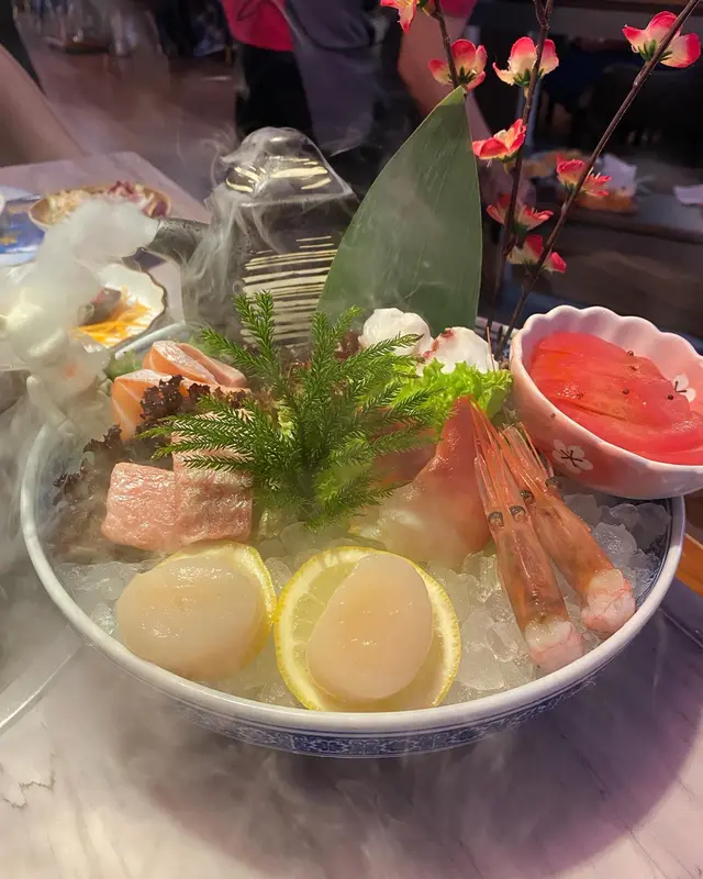 另外我再叫了「雞中亦」、「松露蝦多士」、「椒鹽白飯魚」和「炒蜆」,必提的是雞中亦完全係即炸完熱辣辣咁來,脆卜卜非常熱氣香口而且係肥雞翼肉多出煙。蝦多士和白飯魚又係即煮的溫度熱辣辣的好難唔好食。反而炒蜆係正常普通製作有點咸。刺身盤有三文魚、蝦、北寄貝、八爪魚、帶子,來到時是有冰感,沒有雪氣味,是新鮮的,同平時的「放題刺身」不能相題並論,今次的刺身整體表現不錯,我鍾愛帶子和蝦。好了,由於怕太飽打不到邊爐,我們跳過雞煲不吃,直接就來花膠湯底打邊爐。先來一客海鮮拼盤,有鮑魚、鮮蝦、蟶子、蜆、貴妃蚌、魷魚、九肚魚、急凍蠔、迷你帶子、釀冬菇、珊瑚蚌、魚肚、魚旦,嘩嘩嘩。最值得提:九肚魚:超細心竟然係開邊起左中間係骨,第一次用九肚魚打邊爐,只可以講無得頂,好嫩滑,水感,滑溜溜,好好味道