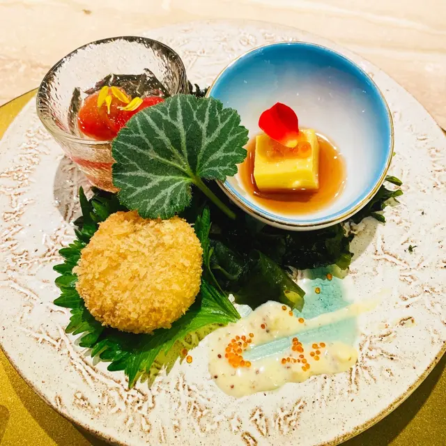 同事話想帶我去試下公司附近廚師發辦的日本料理試下,於是相約了這個晚上來到這間餐廳試試。餐廳位於大廈的12樓,一出𨋢行入少少便是餐廳了,座位不算很多,還有一個包箱可供客人預約。我們安排坐在壽司bar枱,一方面可以看到廚師為我們準備食物,另一方面方便廚師跟客人交流互動!我們點了一個廚師發辦的套餐「金鮨」,包括有前菜、8款刺身、6款壽司、一款熟食、湯及甜品!對於女仔來說這個餐真的很飽呢!前菜:共有3款,包括酸汁車厘茄、麵豉豆腐配三文魚子及炸野菜薯餅!個擺位有種椰林樹影既感覺,好靚!車厘茄本身已經多汁,再配埋個酸汁特別開胃!豆腐跟平時食到既唔同,口感特別!炸野菜薯餅唔會炸得過火!8款刺身包括左口魚、北海道真蠔、海鰻bb、八爪魚吸盤、太刀魚、鮟康魚、海膽白蝦配黃金三文魚子、拖羅、鮫魚左口魚配有柚子胡椒汁,更能特出魚既鮮甜!北海道真蠔,海水味都幾多,而且蠔肉creamy!海鰻bb配冷麵汁、八爪魚吸盤及熟食八爪魚仔,第一次食海鰻bb,感覺很特別,好似食緊河粉但係又有眼睛的!八爪魚吸盤爽口,唔駛點醫汁都已經好鮮!海膽白蝦配黃金三文魚子,海膽好鮮甜新鮮,白蝦爽口,黃金三文魚子好QQ,有啲似食緊珍珠奶茶既珍珠!壽司方面有6款包括海膽三文魚子、針魚、帶子、燒拖羅、鹽昆布深海池魚、野生油甘魚!針魚配有薑蓉,能夠辟去腥味!帶子配韓式辣醬,帶子跟平時食到的不同,而且配有辣醬已不用點豉油食!燒拖羅配有脆魚仔,脆魚仔可以減去拖羅本身既油膩感,而拖羅亦入口即溶!唔太中意食拖羅既我都中意食!燒物為鮑魚天婦羅,呢款天婦羅真係第一次食,鮑魚爽口彈牙,而且配埋附有既筍一齊食口感又會不同還有一些蟹膏可以點黎食!而且呢坎菜式又像一藝術品一樣,擺位很美!係一個非常特別既體驗!𩶘魚湯,呢個湯係有好明顯既魚味,同平時飲既魚湯一樣都是奶白色的,清清地可中和油膩感!最後還有甜品士多啤梨奶凍,非常完滿!總括黎講,廚師上每道菜都會講解食法同介紹,而且如果你行開左會等你返黎先會再上俾你!廚師發辦黎講呢度價錢唔會話好貴!有機會一定會再黎!…查看更多