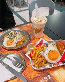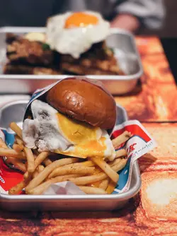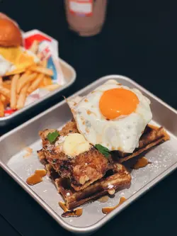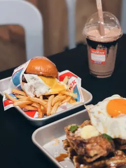 西環美式Comfort Food人氣小店No Milkshake No Life原來在不遠處開了姊妹店,就在水街金祥排骨麵對面一條不顯眼的小巷內,同樣是賣美式邪惡美食,當然也有招牌Milkshake!姊妹店的空間比NMNL大得多,很有慢活的的Weekend Vibes。禮拜日Tea Time來到也可以慢慢Chill!和牛芝士太陽蛋漢堡配薯條 Wagyu Cheese & Egg Burger w/ Fries $138和牛漢堡肉厚身Juicy,紮實而不鬆散。配料簡單不花巧,半溶芝士、焦糖洋蔥和畫龍點睛的House-made Sauce,還有鬆軟有彈性、富牛油香的麵包,Burger整體高質。幼身薯條加上Cajun辣粉,若份量多一點就更滿足。巴域爵士炸雞太陽蛋華夫鬆餅 Signature Fried Chicken & Egg Waffle $138作為人氣No. 1,期望當然特別高。除了大大隻太陽蛋鮮艷吸睛外,炸雞也是美式的大Size。外層包有一定厚度的炸漿皮,炸得卜卜脆,加上有糖漿的點綴,好邪惡。炸雞熱辣辣,肉質也不錯,尚算Juicy。Waffle比想像中薄身,略嫌少了點紮實的口感,但脆度不錯,配上流心蛋黃和糖漿,美味!花生醬朱古力奶昔 Peanut Butter Chocolate Milkshake $69作為NMNL的Milkshake Fans,來到姊妹店不能不來一杯。Peanut Butter Chocolate兩種味道都很突出,特別是花生醬的濃郁香味,還有花生顆粒碎,認真足料。整體以香港的美式Milkshake比較,Five Guys / Shake Shade的口感較濃稠、甜度較高,一人喝一杯會甜到膩。NMNL或這裡的招牌Milkshake沒有那麼Thick,但也是很濃稠,甜度較適合香港人的口味,味道選擇和層次也較多,但分店不多、不常有機會方便買到!…查看更多