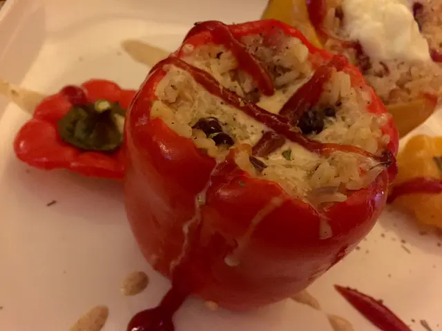 大大個紅椒及黃椒釀入乾果素菜飯,裡面又喺填得滿滿,極飽肚嘅菜式。一個椒面唧上茄醬,另一個唧上乳酪醬,其實感覺有啲迤。還好喺菜式幾清新,米飯又加上提子乾、紅蔥碎,增加口感,如再加少少合桃碎、瓜子仁,相信仲美妙。