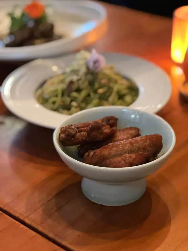 佐敦最近真係多左好多高水準西餐/cafe,前排見到呢間個名幾特別,就決定去食下!估唔到係非常有心思嘅小店🍴由於餐廳只有幾抬位,所以想去最好book~(當日本來無咩人,後來就幾乎滿座了)店員服務好好,會逐一介紹菜式,而且每款好有特色呢🍝麻香海鮮扁意粉($128)- 選了呢款非常獨特嘅fusion意粉,係店內自家製pesto,真係呢到先會食到!食落去係啖啖麻香,但麻而不辣且好rich嘅texture😋,真係啱曬鍾意食麻香,又唔食得辣嘅人~🌟孜然風味原隻單骨雞翼($60)- 呢個都同其他店不同,係罕有地全隻上嘅單骨雞翼!每隻都大大隻多肉,外層脆香,配支孜然粉,惹味香口,而且有成7-8 隻原隻雞翼,cp值高!✨話梅菠蘿醬配窩夫及雪糕($78)- 必點💖waffle非常脆,係好新鮮整起,麵粉不黏口,真係單是waffle都有水準好食。旁邊菠蘿甜甜酸酸的夠特別!整體來說都不太甜,好食得來唔會太heavy😋😋有機會再來食心思菜式!…查看更多