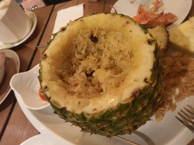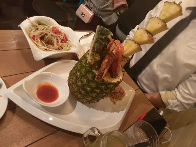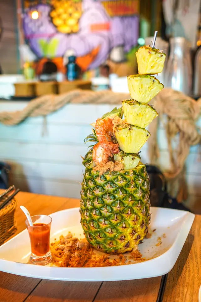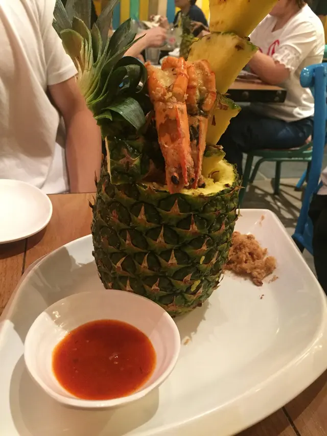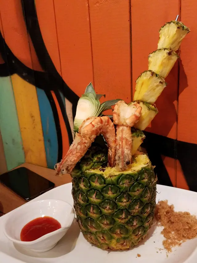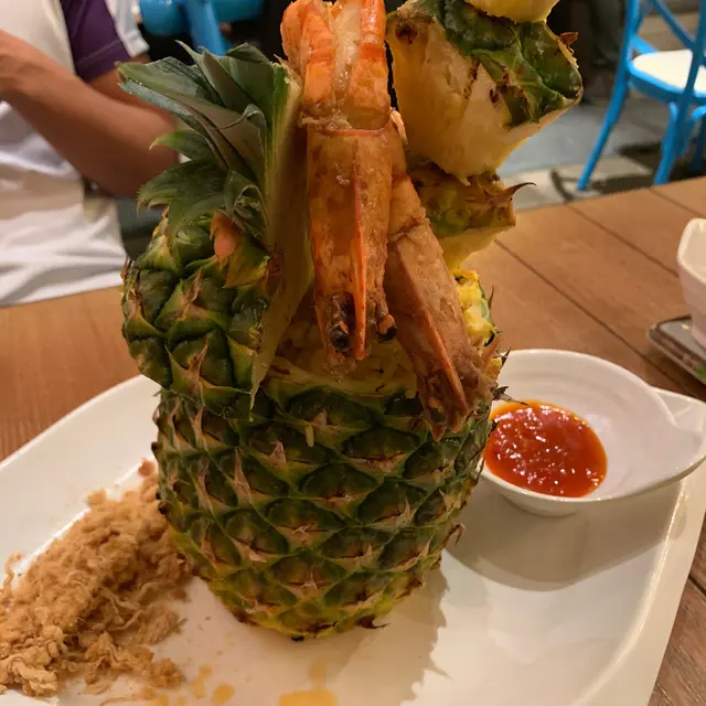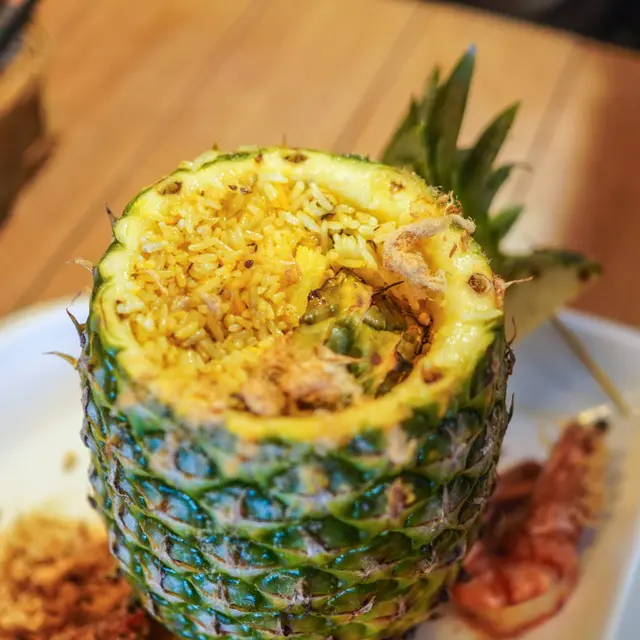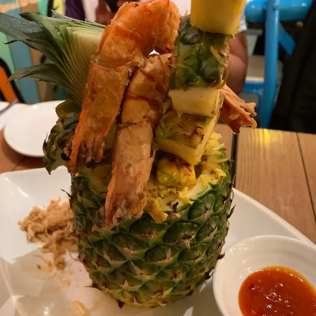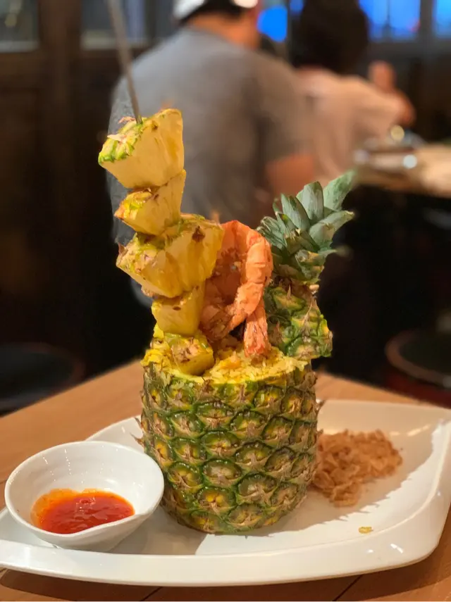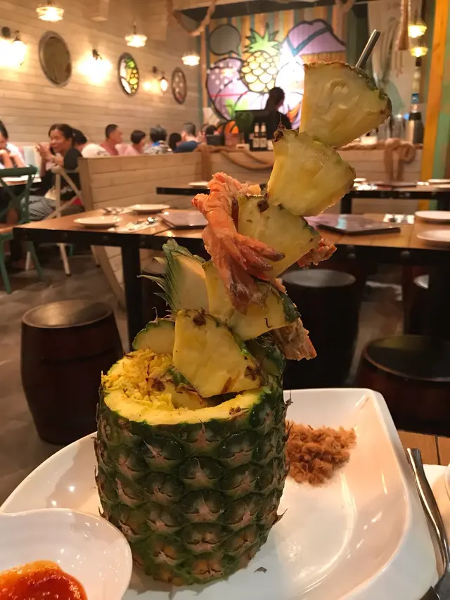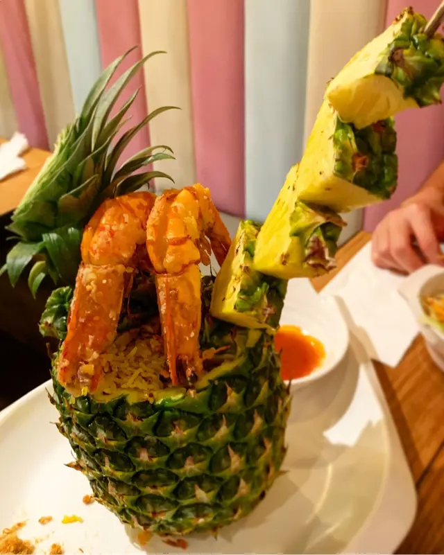 仲有呢個招牌菠蘿炒飯配虎蝦($158)都好推介!推介!賣相一流,原隻菠蘿,而且啲菠蘿串到好高,仲有兩隻虎蝦係上面!即刻打卡打卡!成個菠蘿入滿晒炒飯,啲炒飯加左肉鬆、蛋、雞肉,同埋其他配料,所以食落口感好豐富。鐘意食蒜蓉嘅話,一定要試呢個蒜蓉虎蝦煲($118)。超多蒜蓉,配埋粉絲一齊食,好香口。另外,虎蝦大大隻,本身啲蝦殼已經劏開咗,所以輕鬆食晒啲蝦肉。因為係配蒜蓉,所以啲蝦好入味呀!蒜蓉虎蝦煲免費配一杯熱柚子蜜