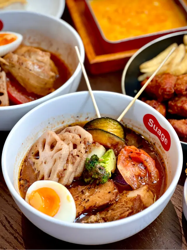 講起北海道美食,湯咖喱必定係三甲內🍛以多種香料及高湯熬製而成,再加入大量蔬菜及肉類,成為無法抗拒嘅美食🤤被譽為北海道第一湯咖哩「Suage」,湯咖哩湯底採用日本自家農場的原材料🇯🇵呈現北海道原味道‼️.🍴炙燒豚角煮湯咖喱💰$92湯咖喱可以自由選擇辣度,揀咗Lv8勁辣🌶️說實話同日本一樣唔係太辣,大約譚仔三小辣左右😂湯咖喱充滿香料味且帶高湯既有鮮香,微辛感增添刺激😛白飯會跟埋檸檬,將檸檬汁加入白飯再與湯咖喱撈勻,檸檬酸味增添咖喱香氣🍋送飯一流👍🏻豚角煮肉質軟嫩,蔬菜有薯仔、南瓜、茄子、蓮藕、蕃茄💕特別鍾意蓮藕,好爽脆😚.🍴脆皮雞腿肉串湯咖喱💰$96雞腿肉大大舊,吸收晒湯咖喱精華好好味😋最重要無骨啖啖肉🍗一啖肉一啖飯勁正😝.🍴芝士Fiesta💰$98小食盤配熔岩芝士🧀內有炸雞塊、薯條、雞肉丸、洋蔥圈,將熔岩芝士倒落去超邪惡😈份量都唔少,三四個人分啱晒🤓.🍴海苔天婦羅魷魚💰$28海苔薄脆,內裡爽彈魷魚🦑香口小食…查看更多