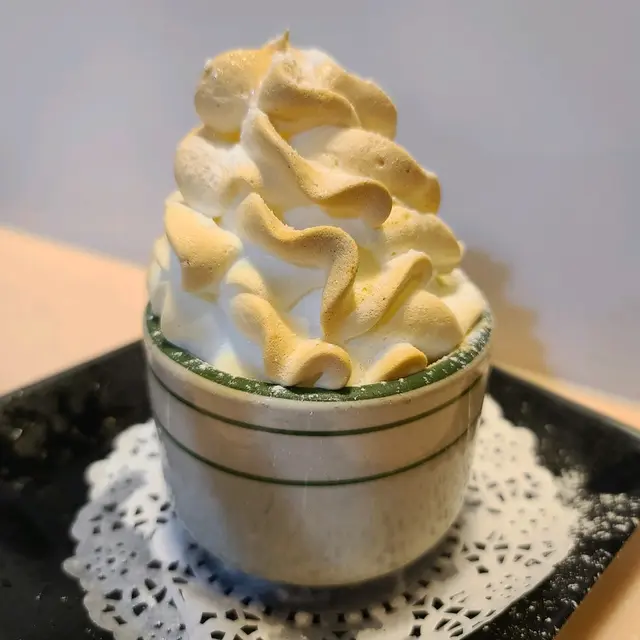 相對雪糕質感較為死實難切開;旁邊還有新鮮香甜多汁的芒果肉、奇異果及士多啤梨片...!焗冰火芝士木糠布甸 $65需時約 10分鐘以咖啡杯盛載,看似一杯咖啡雪糕!