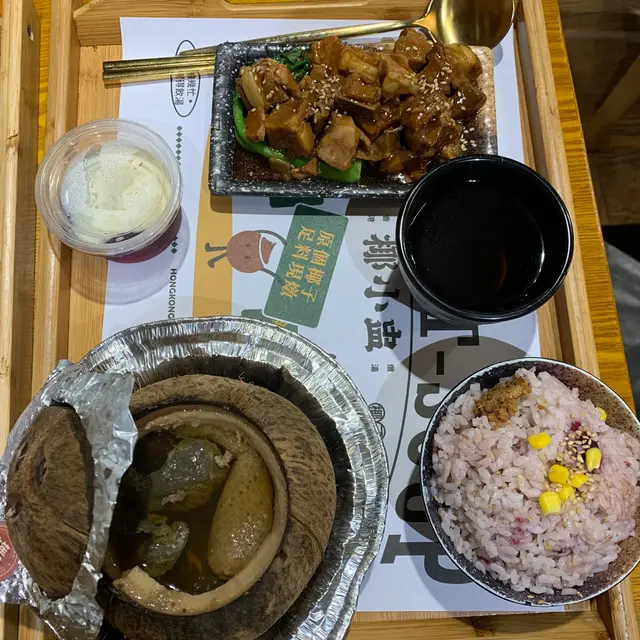 來到太古, 時間尚早, 決定先吃個早飯, 避開午市人潮。見小店主打燉湯, 飯可選紫薯飯, 感覺健康, 且標示2020和2021兩度蟬聯米芝蓮推介街頭小吃, 應有一定質素, 便光顧了。 小店座位不多, 採自助取餐及回收餐盤。午飯時段座無虛席, 驟看每枱也有點湯品, 頗受歡迎。 1) Y5 當歸乳鴿四物椰小盅 $842) B2 焦糖醋香排骨 $303) 紫薯飯4) 特式茶: 自製山楂茶5) 啫喱: 花倫啫喱當歸乳鴿四物椰小盅有補中益氣, 調理止痛的功效。湯以椰盅盛載, 打開盅蓋, 中藥味濃厚樸鼻, 但入口中藥味竟不重, 頗清甜。湯有點燙口, 喝畢感覺暖笠笠。湯料有乳鴿和少量中藥材, 鴿肉煲至腍身, 骨肉易分離。椰盅的椰子肉十分硬, 刮不到吃, 內心不禁懷疑椰盅不會回收重用吧, 見收據標明椰子只用一次, 便釋懷了。紫薯飯有紫米和紫薯粒, 伴有肉鬆和粟米, 增添口感, 唯紫米和紫薯量不多, 纖維感不足。 焦糖醋香排骨肉雖腍但偏柴口, 有白色軟骨的排骨比例高, 算易咬開。伴有少量爽口的椰菜, 醬汁有點油膩, 凍了有白色油脂浮面。 特色茶為自製的山楂茶, 味較濃郁, 有澀味。 啫喱提子味香, 有大片菠蘿肉, 增添口感。花奶令整體味道恰到好處, 入口順滑。…查看更多