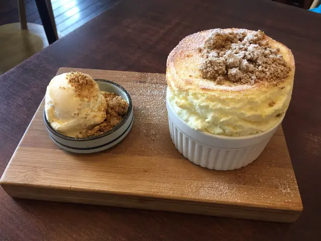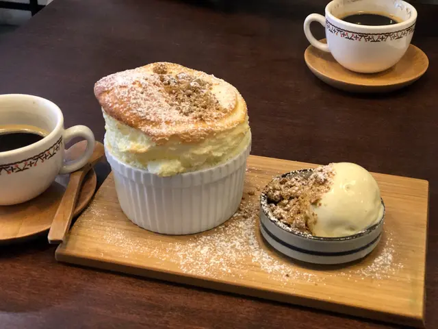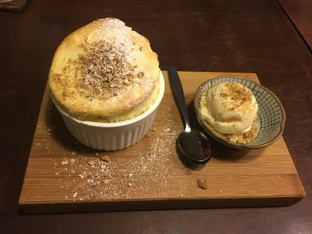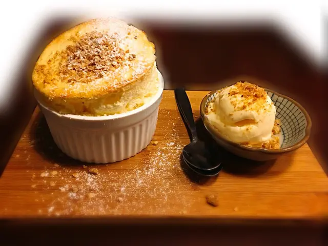跟餐-抹綠奶茶/杏桃茶/蘋果茶  另加:可可上次上試凍抹綠奶茶,今次試熱,抺茶味依舊偏淡。飯團餐-梅子飯團,日替飯團:份量太少,飯團味道一般。揚物餐-七味雞唐揚 ($66): 揚物餐包括沙律,淙伴豆腐,飯。沙律新鮮,芝麻醬汁開胃。七味雞揚雖然炸得香脆可口,但只得四粒,份量少得驚人。 炸雞裡面是南瓜蓉,味道很好。揚物餐-吉列豬扒 ($59):炸得金黃香口,份量足夠。炸年糕:好像售價$42,但份量只有四小粒,而且味道普通。焦糖杏仁芭菲窩夫 ($39):窩夫較厚身,質感似蛋糕內層鬆軟,配香草雪糕。焦糖杏仁芭菲味道很不錯,不會太甜。燕麥榛子梳乎厘 ($48): 需時近20分鐘製作,熱哄哄的梳乎里,配香草雪糕上面還有果仁碎。高聳的外表,鬆軟的內層,蛋味濃郁,甜度適中。註: Soufflé一字來自法語中一個動詞souffler的過去分詞,意思是「使充氣」或簡單地指「蓬鬆地脹起來」-恰如其分地描述烘焙當兒蛋白與奶黃結合時的情況。…查看更多