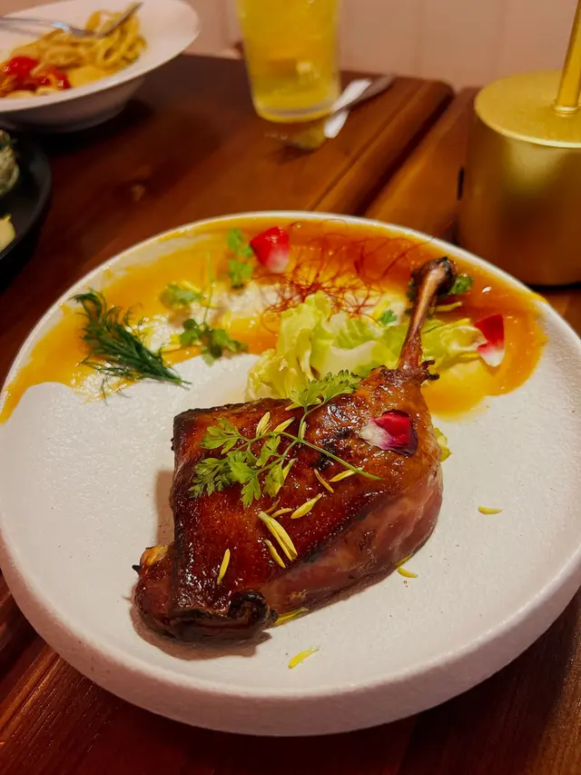 餐廳由法國藍帶廚師主理👨🏻🍳提供精緻的法式料理環境舒適配搭柔和燈光感覺和諧😌以$699半價品嚐6道菜晚市二人套餐🍽️每人$350就能吃到豐富的法國餐很划算🤑餐前提供兩塊餐包🍞蘸上橄欖油及黑醋另有風味🍞First Course香草魚茸薯仔沙律配檸檬醬🥗細膩魚茸融入細滑的薯蓉🥔,加上新鮮爽脆的沙律菜,香脆的麵包粒及車厘茄🍅,再配搭檸檬醬更開胃😋,作為前菜非常適合Second Course野菌忌廉湯🥣喝到濃郁菇菌味🍄🟫,入口香滑軟綿Third Course低溫慢煮雞胸扁意麵配冬陰功醬汁🍝慢煮雞胸肉質鮮嫩,扁意粉軟硬適中,吸收了冬陰功醬汁很入味,微辣惹味🌶️,餐廳很貼心上碟時已經分成兩碟意粉Fourth Course紅館姜母鴨🍗這道菜是朋友點來試試,而我平時很少會吃的,鴨腿🍗燒得恰到好處,散發出獨特的香氣,皮脆肉嫩,配上姜母醬酸酸甜甜,比我想像中好吃很多👍🏻法式香草焗蝸牛配薯茸🐚有8隻法式蝸牛以香草及牛油🧈一起焗製,濃香四溢,粒粒飽滿彈牙,配上底層的薯蓉口感順滑綿密一起吃很合拍,店員提供叉及竹籤方便進食Fifth Course芒果拿破崙🍰酥皮鬆化,一層一層夾著吉士及芒果🥭,甜度剛好鮮果芝士撻🥧芝士餡香滑,伴有藍莓🫐吃更滋味Sixth Course水果茶🍹水果茶包及檸檬片味道較淡,清新解膩…查看更多