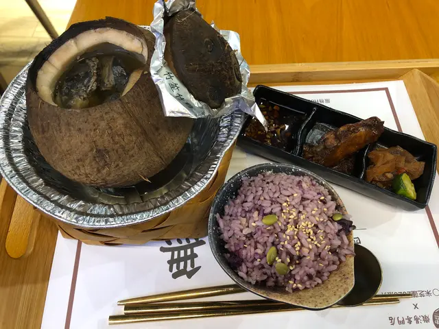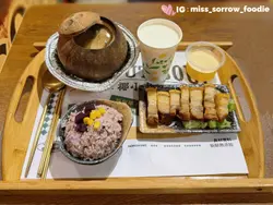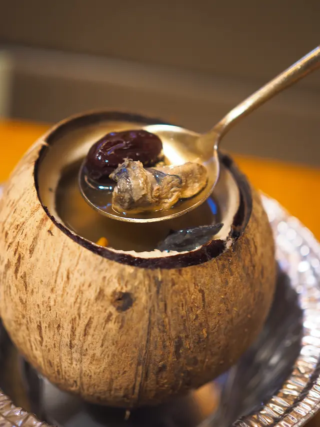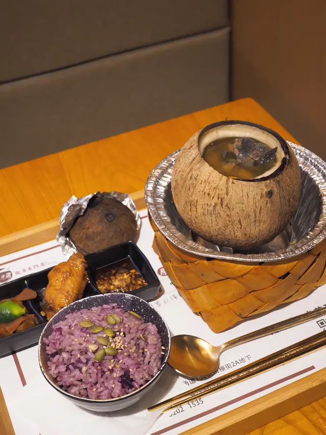 呢間餐廳以原盅椰子燉湯聞名🥥全店湯品新鮮無添加,皆「零味精、零鹽、零糖」,更連續兩年蟬聯米芝蓮推介街頭小吃👍🏼💗織金竹笙烏雞椰小盅($72)選用南海椰子,加入烏雞、杞子、淮山、紅棗、大竹笙、椰子水燉足四個鐘,夠哂火候,湯色金黃清澈,飲落除咗有椰子嘅清甜,仲有烏雞嘅肉鮮,最正係竹笙大大塊爽口🍲呢款湯特別適合女士,有益氣養血、美容養顏功效👸🏻💗脆皮燒腩仔配紫薯飯跟鮮榨椰汁+啫喱 (+$40)燒腩仔肥瘦相間,味道鹹香,充滿肉汁同油脂香,塊皮夠哂酥脆🐖紫薯飯軟為濕軟,加入粒粒紫薯同粟米,更有營養高纖🍚跟餐送一杯鮮榨椰汁同花奶啫喱🍮💗蟲草花幹貝土雞燉鮮鮑椰小盅($90)原個椰子加入新鮮鮑魚、土雞、蟲草花、鮮乾貝、芡實、椰子水等材料燉製,味道更加甘甜濃郁,最驚喜係隻鮑魚大大隻又爽嫩,真係夠哂足料🐚呢款湯有平肝固腎,提升免疫力嘅功效,飲完成個人暖笠笠♨️💗撈公仔麵+祕製雞翼1隻 (+$12)撈公仔麵彈牙有嚼勁,配搭一隻滷水雞翼🍜💗桂花酸梅湯 (+$6)桂花酸梅湯酸甜冰涼,有助解膩消滯🌼💗糖醋排骨($45)糖醋排骨炆得軟腍入味,瘦肉多唔會淨係得骨同肥肉,味道甜酸好送飯🍖…查看更多
