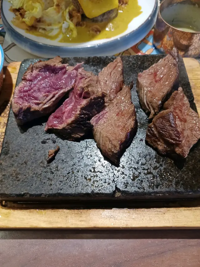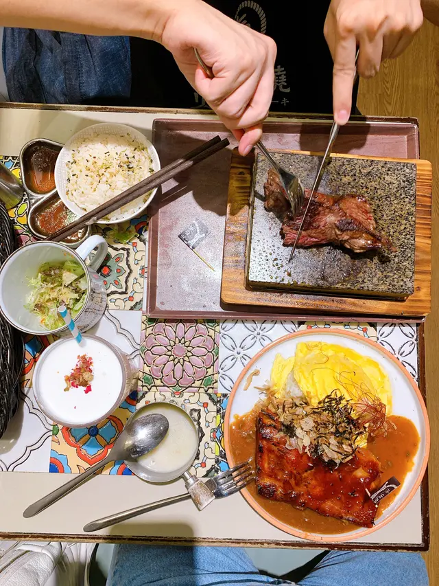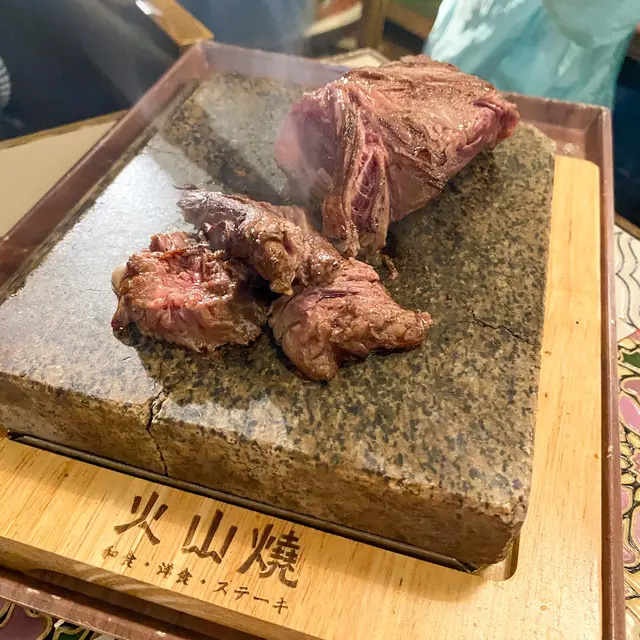 與好友打完網球後,就在荃灣區內來個下午茶去補充營養;之前做過功課,比較方便的話,在荃灣廣場附近的大壩街有好多新舊餐廳美食可供揀選,最後選了火山燒;與好友來到餐廳,掃了出行碼及針咭,便徐步內進;從門面的簡約明亮感,到室內的木質柔和風格,木紋格調為主配合柔亮的燈光,令人置身其中覺得相當舒服!而枱面亦有經過精妙的設計,中間的歐式古典花紋搪瓷,不但美觀,而且更有防熱作用;(在餐廳內的侍應姐姐態度良好,招呼到位!)下午茶有適量選擇,都是以套餐為主,且價錢十分合理;店內既有實體餐牌,更有手機掃描QR Code來點餐,科技化帶來客人的更方便,小店也有此服務值得一讚;與好友基本上都屬意火山石板燒的兩個套餐,加上一輪曝曬的運動之後更需要澱粉質補充,加了一個鰻魚丼飯;三個套餐都配上西日餐湯及餐飲,而且餐飲的配料可隨個人口味加減,好貼心!好快三個套餐一齊上;兩塊火山石板熱度真的高,其中面上放著的聖安娜安格斯封門柳不斷冒煙,發出吱吱聲,更在半空釋放著充滿牛脂的香味!日式的麵豉湯味道與質感還可以,反而忌廉湯有驚喜,質地與味道都很好,更有味感!我先來品嚐封門柳;其整體雖然比較大塊,但肉質很軟嫩,切了一小塊在石板上將底面都輕煎了數下,到一半以上的熟度,直接點上香料醬汁送入口中;咀嚼了幾下,口感十分好,明顯感到肉質肉汁油份的融合,煙燻味及醬汁加添了層次,伴以珍珠飯同嚼,濃郁的牛肉味與米飯的甜美簡直是幾何級的上升!香煎美國頂級牛板腱片就需要少少技巧,先將牛板腱片蘸上一層厚厚的附於食材盤內的生油,一放於石板上即時油份水份都溢飛彈起,牛板腱片極速地滾熟,好在繫上餐廳派發的圍裙令上衣免於被濺到;點上甜醬油,更突出牛板腱的肉味,牛板腱的肉質本身比較緊緻,切成片狀後可令口感更好,高溫快煮也是另一關鍵,逼出牛脂的香味與質地,咀嚼在口中能感受到腱片的爽彈綿滑,伴飯同吃更突出珍珠米飯的飯味,確也是美味非凡!與好友一邊月旦當下,一邊細品自煎的美食,接近一小時才食完兩個石板燒套餐,而蒲燒日本鰻魚忌廉滑蛋飯竟然尚保持著暖暖的溫度!鰻魚的鮮味與甜醬交織,忌廉炒蛋很滑溜,配上珍珠飯,整體的水乳交融,不但飽肚更是齒頰留香,回韻綿長!最後一提,炭培烏龍茶玫瑰海鹽奶蓋的茶底十分香濃,確有解膩提神之效!熱薑蜜的香味也非常強勁,氣味縈繞半空,果然夠薑!火山石板燒物的重點,石板一定要夠滾燙,另外配上高質的食材來煎/燒就能輕易造出令人垂涎的食物,這次在荃灣的火山燒完全感受得到!人均不到港幣130,能在一次過被數款美食填飽了肚子之餘,又滿足了味蕾,如此高性價比一定有下次!…查看更多