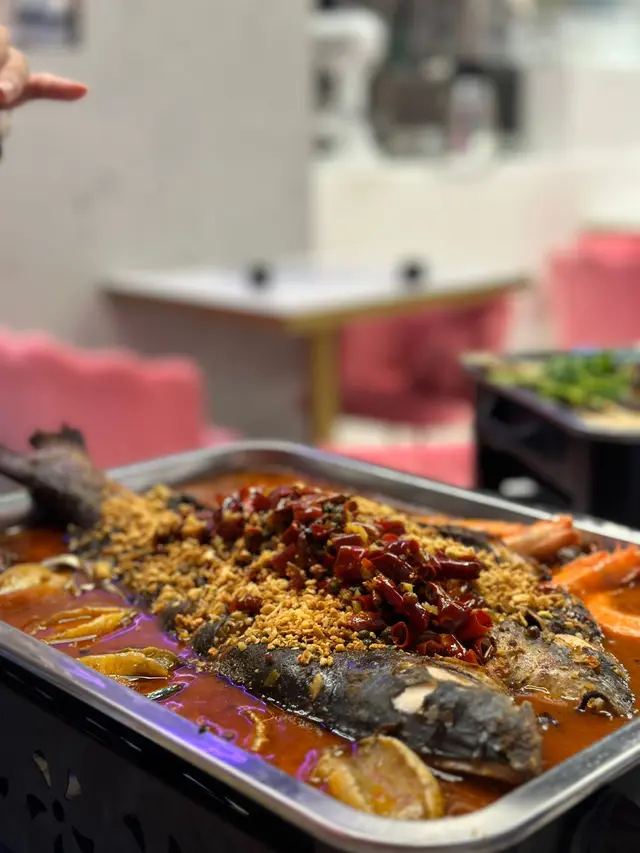 我真的沒有想過烤魚店這類算heavy的餐廳,裝修可以做到粉紅少女風,又有大量花花,好新奇!烤魚三部曲,先選魚種,再選口味、自選辣度及配菜。除了麻辣及青椒,不吃辣的也可以吃蕃茄或豆豉口味。至尊麻辣烤魚 $458最豪華的組合一定是至尊麻辣烤魚!除了原條清江魚,還有大蝦六隻及鮑魚六隻,底部還有豆皮呢!單吃這些都飽了吧?清江魚是兩款中較便宜的魚,但是魚肉雪白軟滑。大蝦及鮑魚都大隻又飽滿,份量十足,肉質爽口彈牙。跟麻辣湯一起吃惹味又不會太搶。吃過烤魚後,濃厚的麻辣湯不要浪費,點幾個火鍋配菜打邊爐就最好不過了!不過我只有兩人點不到那麼多,只嚐嚐他們的牛肉。安格斯牛小排$168注意這牛小排的份量是一整份!坊間這價錢通常都只有半份,所以這款絕對抵叫。牛小排片切得厚度適中,涮幾下就很快可以吃了。它的脂肪分佈平均,所以吃起來口感尚軟又有牛油香,牛味亦都夠濃郁,好抵食呀!又海鮮又牛,來這裡吃麻辣烤魚吃得好滿足!…查看更多