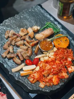 牛肋骨肉加牛板腱肉燒肉火山石板滋滋作響,肉香四溢