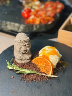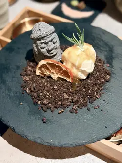 限量供應濟州爺爺以黑芝麻朱古力慕絲包著柑橘果泥,配雪糕清新滑溜