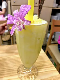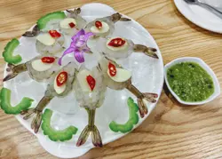 泰式生蝦刺身,入口清爽彈牙,蝦刺身配搭一片蒜頭和辣椒粒,再點青色的醬汁, 彈牙清爽的蝦刺身味道配搭得清香味美